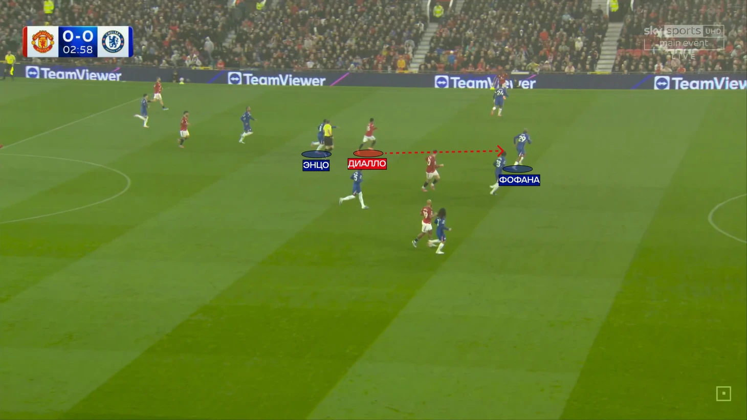 В следующем эпизоде заметно, что по Бруну играет Энцо, а Диалло снова открыт. Окей, если бы мяч пошел не на Мбемо, а на Амада, то кто бы тогда накрыл его? Фофана? Нет, слишком большое расстояние от игроков. Джеймс? Если бы Рис выдернулся, то «Челси» рисковал бы получить опасную атаку через левый фланг. Даже не взирая на удаление, в игре в равных составах «синие» имели тактические проблемы в защите, которые неясно как решились бы.