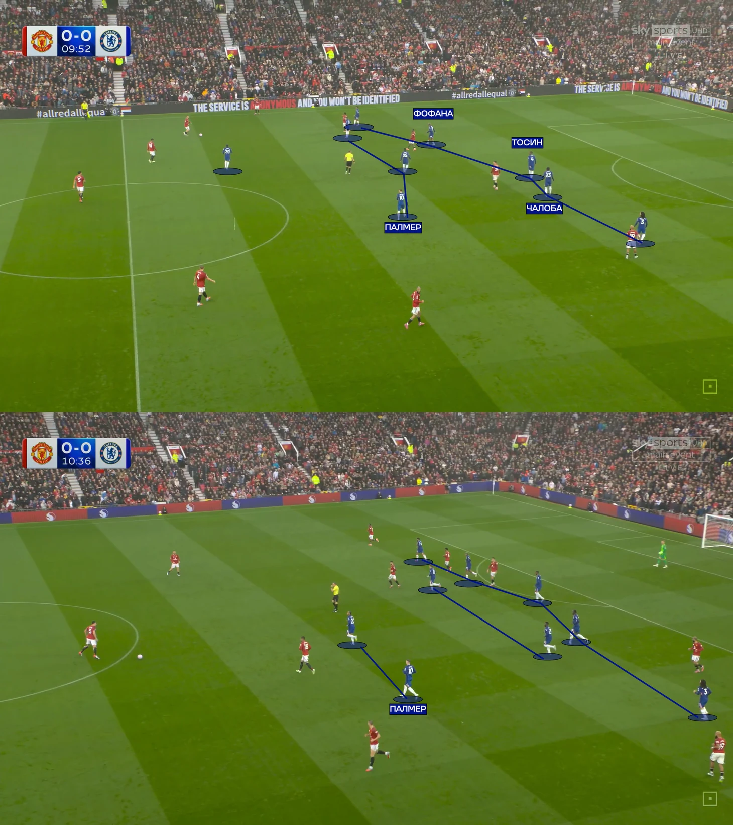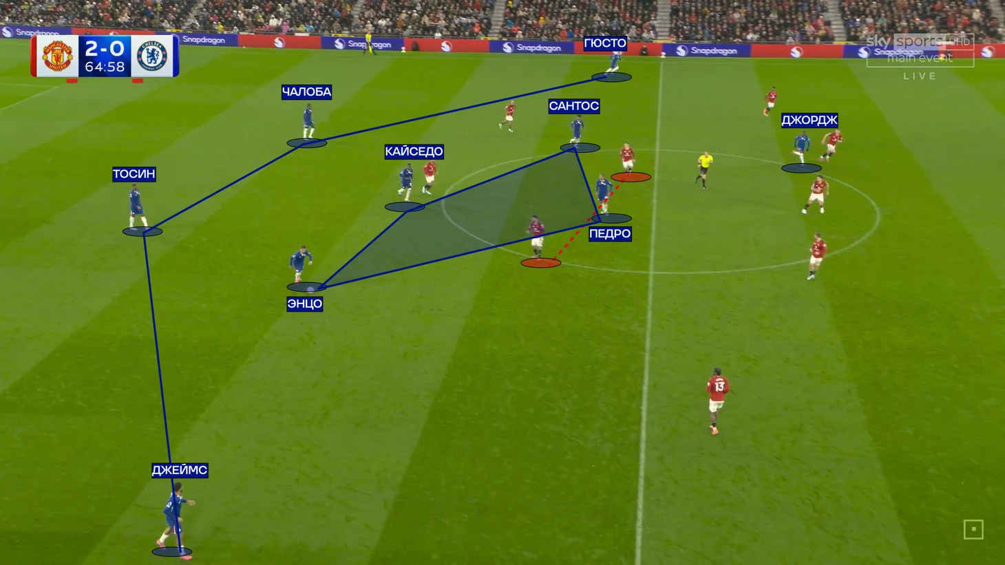 «Челси» перестроил структуру билдапа. Игра в равных составах наконец-то позволила «синим» хоть как-то разыгрывать мячи. Если «МЮ» давал возможность, то к розыгрышу подключался Йоргенсен, а Фофана уходил во фланг. Рис Джеймс занимал позицию номинального правого вингера. В центре поля Находились Кайседо и Сантос. Энцо действовал выше.