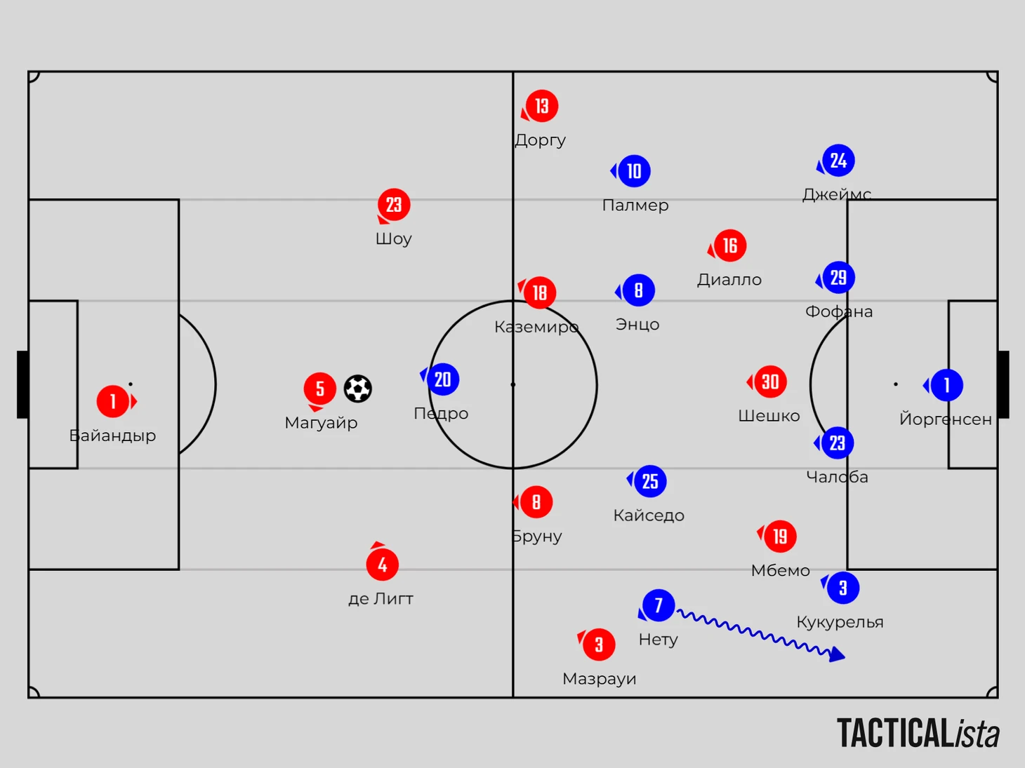 «МЮ» стал уязвим на флангах. Из-за того, что Педро балансировал между «десяткой» и «девяткой», Де Лигт не мог выдергиваться на Энцо, поэтому эту роль взял на себя Доргу, оставив одного Джеймса. Посмотрите на атаки до гола Чалоба – все они пришли с правого фланга, как раз благодаря Рису или подключениям атакующей группы в полуфланги.