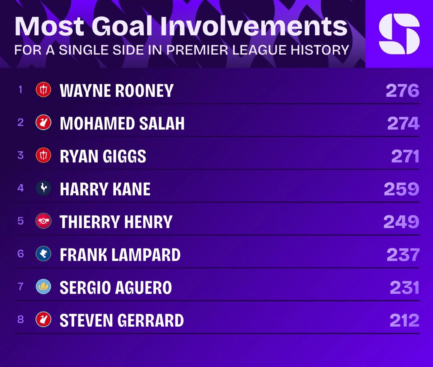 Статистический портал Squawka составил исторический топ-8, в список попали футболисты с наибольшим количеством результативных действий за один клуб в Премьер-лиге. Салах занял вторую строчку, а первое место пока остается за Уэйном Руни, который за «МЮ» в чемпионате оформил 276 по «гол+пас».