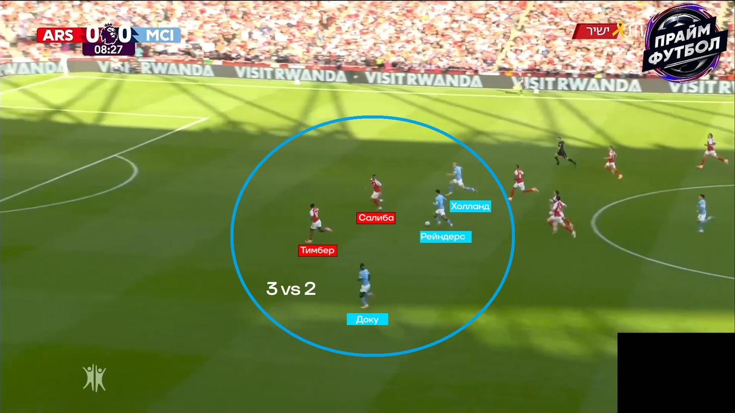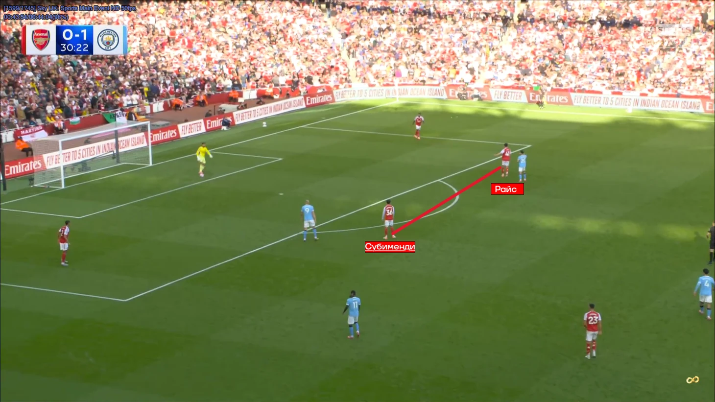 К середине тайма, когда прессинг «горожан» еще был достаточно активен, Артета стал опускать Деклана вместе с Субименди на свою треть поля, и это серьезно помогло «канонирам» в концовке тайма.