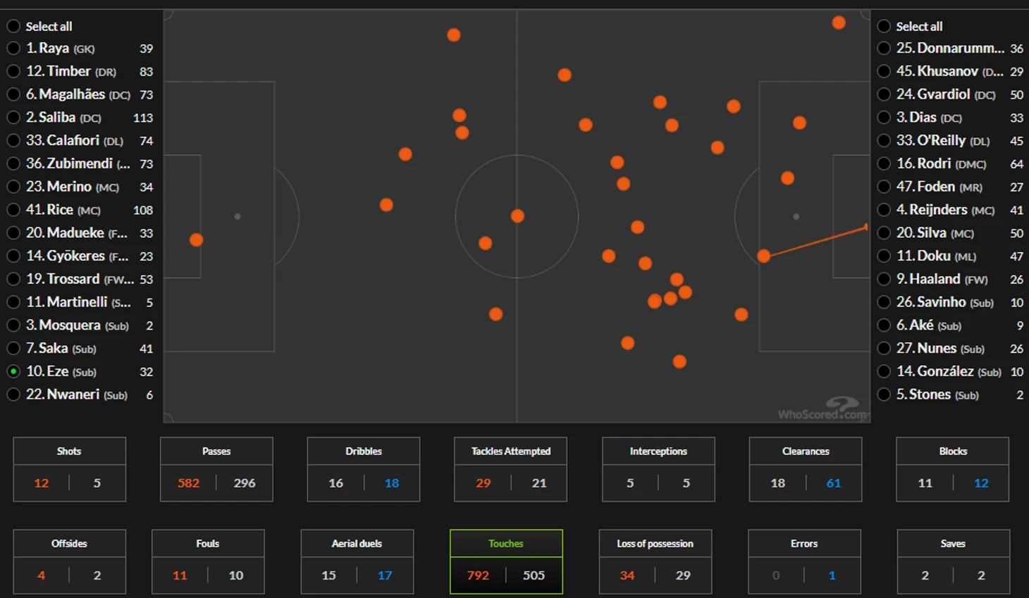 Даже после гола «Арсенал» продолжал настаивать на такой же агрессивной формации, которая в хорошем свете так и не проявила себя. Прессинг «канониров» ничего не смог поделать с вертикализированным «Сити», что подтверждает и статистка: у хозяев лишь 1 высокий возврат мяча за 90 минут. В 5 раз меньше, чем у соперника.