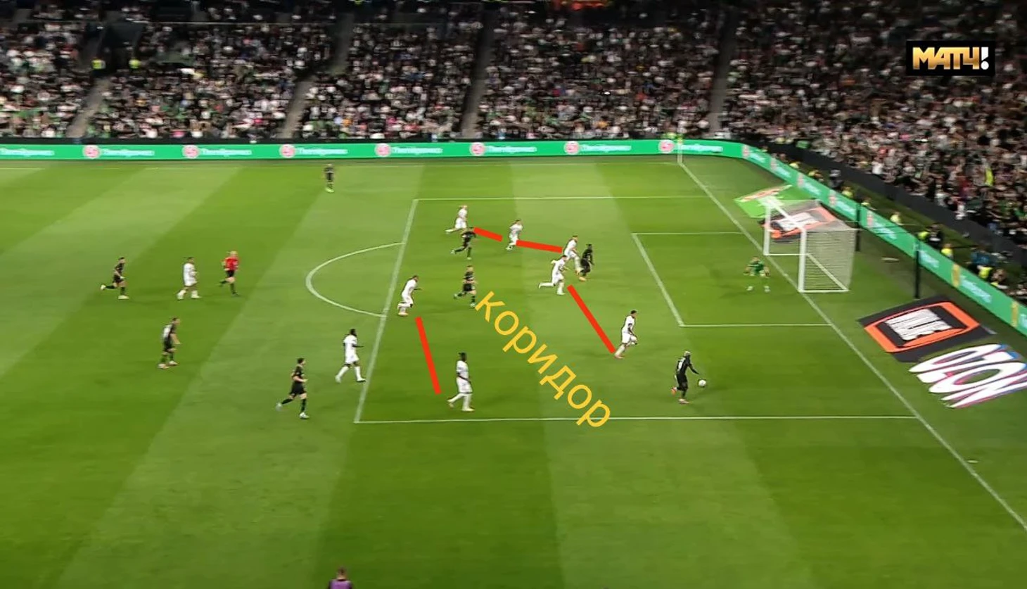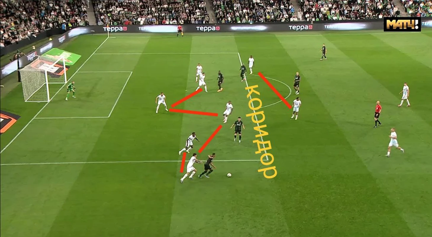 От этого факта плавно переходим к позиционной обороне гостей. Тут оборона начиналась в среднем блоке, но «Зенит» не боялся вжиматься в свою штрафную. Как-то раз я даже заметил низкий блок 7-3 (доказательство не нашёл, но даже если не верите, 6-3-1 и 6-2-2, которые сегодня будут на скринах с позиционной атакой «Краснодара», тоже весьма красноречивы). Вообще «Зенит» не придерживался конкретной формации: мог начать средним 4-3-3, а закончить 6-4 с девятью полевыми в своей штрафной. Так получалось благодаря тому, что у гостей в обороне не было ни единого пассажира: Энрике стабильно садился левым защитником, Барриос – центральным, а Вендел часто страховал Мантуана, если тот оставался 1в1 с Са. За счёт количества обороняющихся сине-бело-голубые были относительно надëжны, но часто оставляли пространство между линий, куда и шли прострелы, приведшие к большей части моментов хозяев. (Примечание: пометку «коридор» на скринах не стоит воспринимать в прямом смысле – им я отметил не сам коридор в классическом понимании, а зону, в которой он может образоваться. На моих кривых скринах коридор выглядит закрытым, но в обоих случаях по итогу прострел проходил)