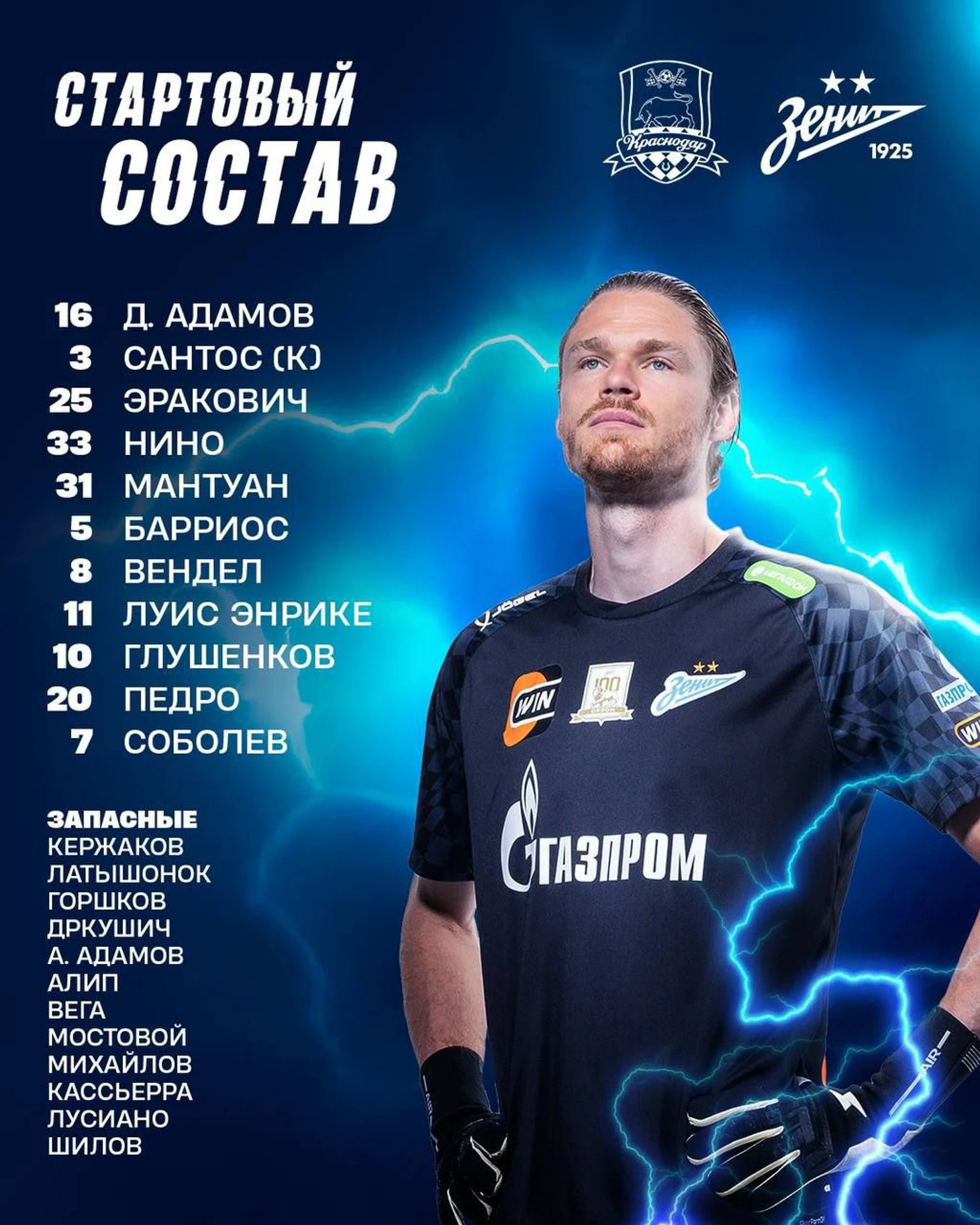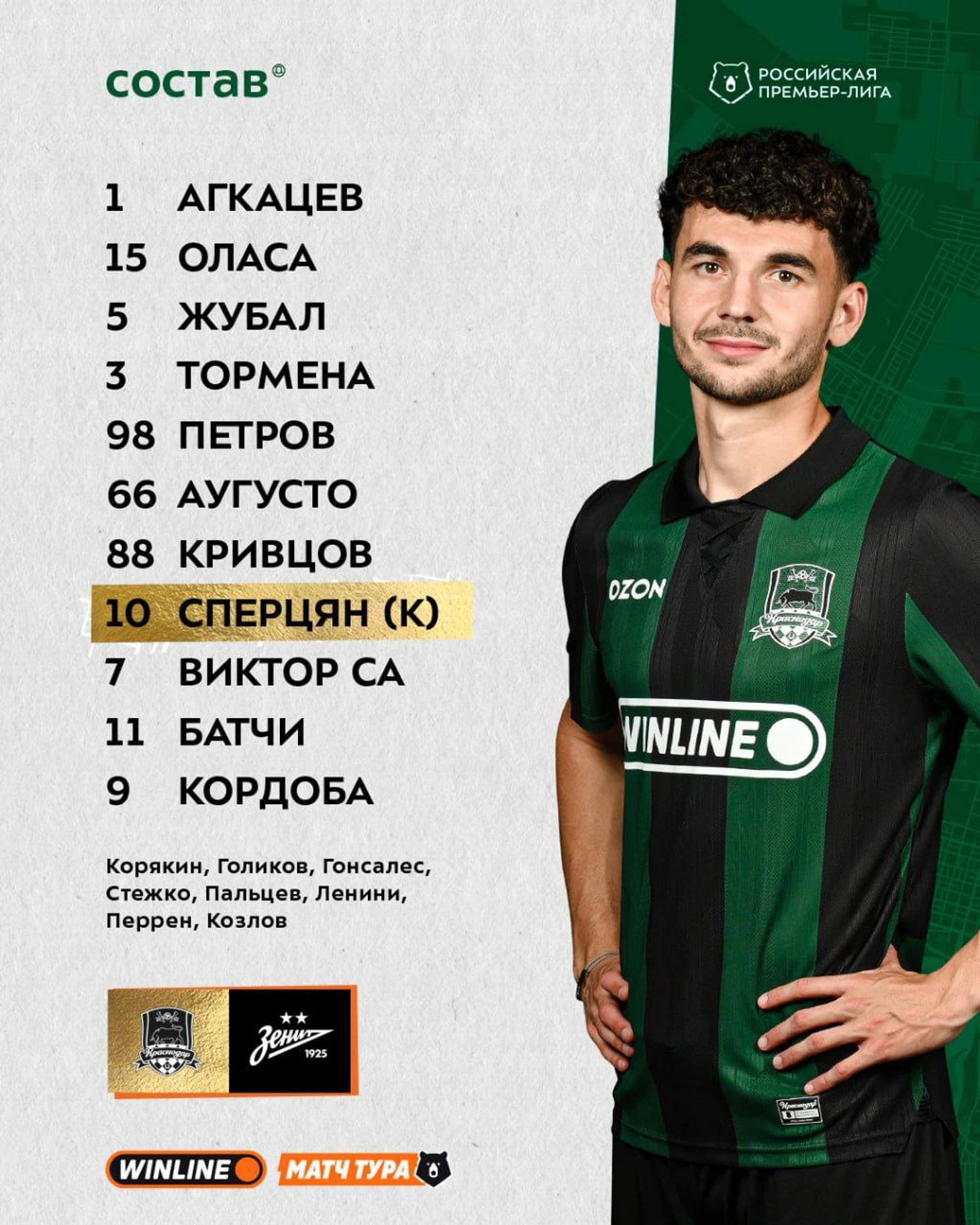 У «Краснодара» отсутствующего из-за дисквалификации Косту заменил Жубал, а травмированного Черникова – Кривцов. Всё же Мусаев решил, что одного разыгрывающего ему хватит, и оставил Ленини на скамейке, выбрав подключения и завершение Кривцова.