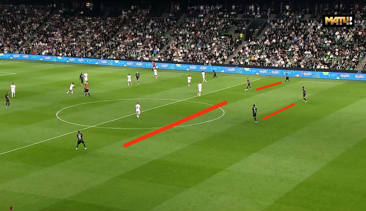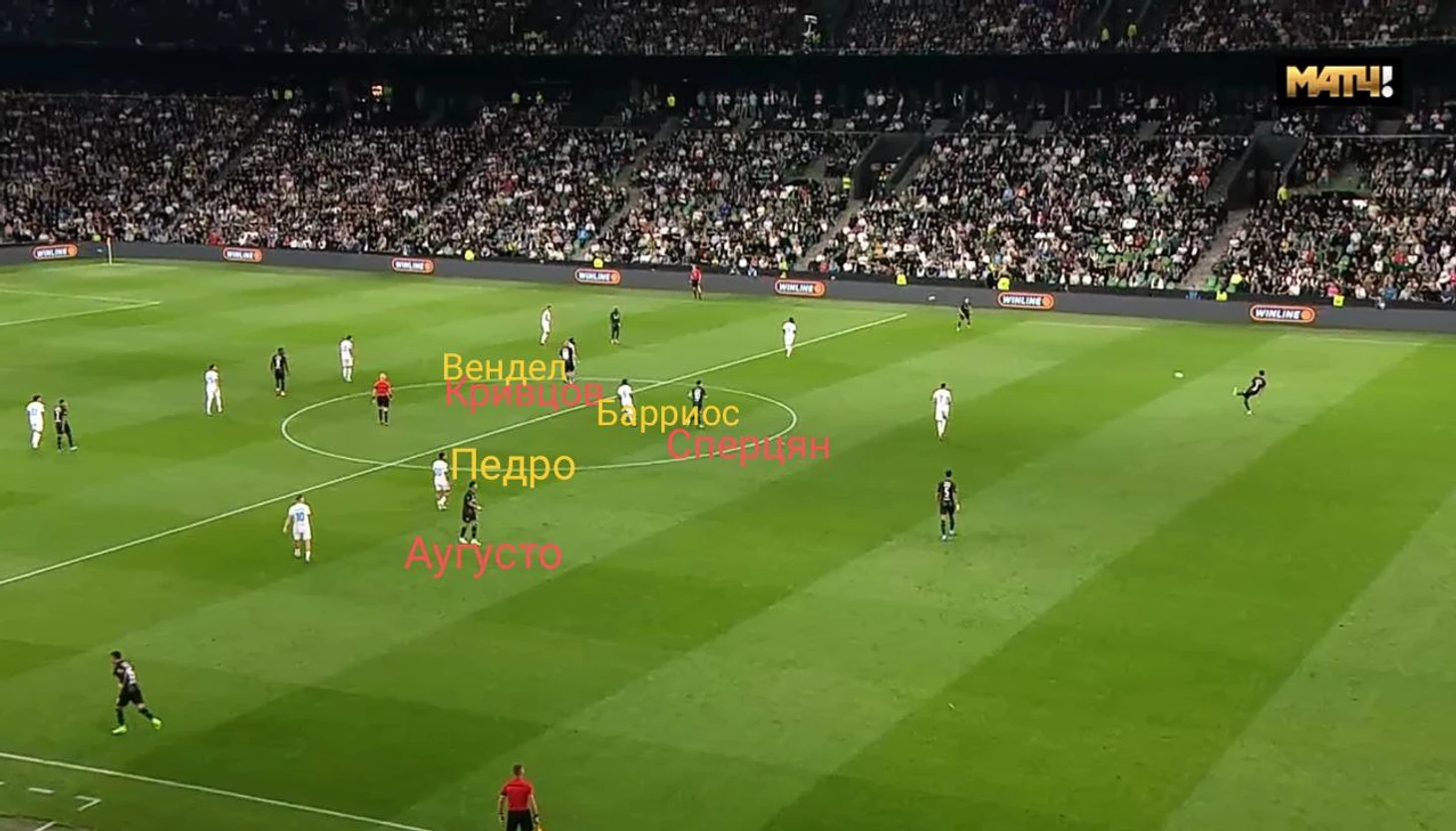 Владение в этот раз чаще начиналось не в трапеции 2+3, а в билд-апе 3+1 (редко 3+2 в случае опускания Кривцова/Сперцяна. Также здесь отмечу более частые чем обычно опускания в центр вингеров), где Оласа уходит уже в тройку центральных, Аугусто остаётся единственным опорником, а Петров сразу идёт выше. С 2+3 никаких проблем не было, но и 3+1 показал себя неплохо. Из различий – больший акцент на игру через центр во втором случае. Хотя, учитывая отсутствие прессинга от «Зенита», розыгрыш мог быть абсолютно любым, так что этот абзац – текст ради текста.