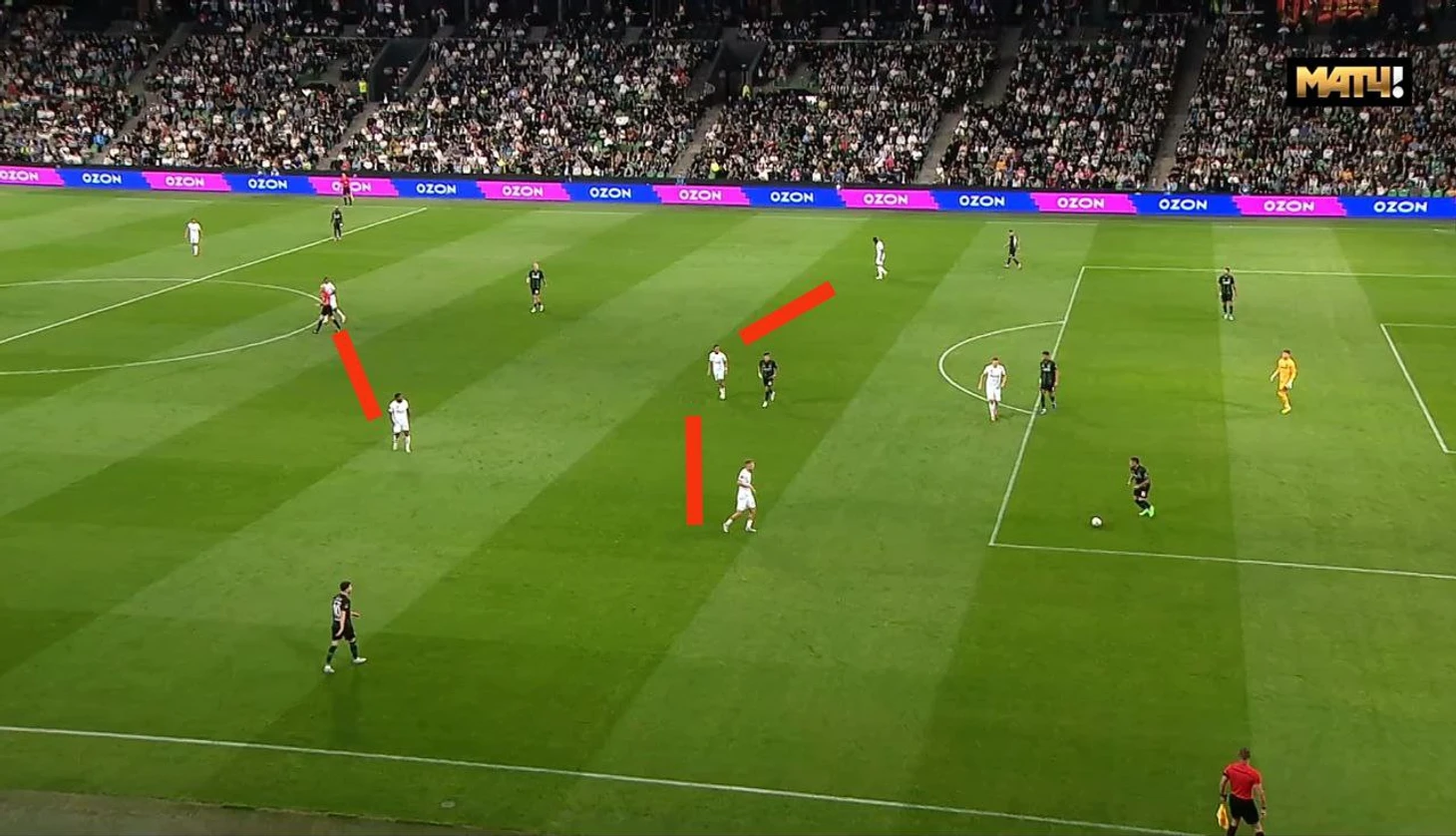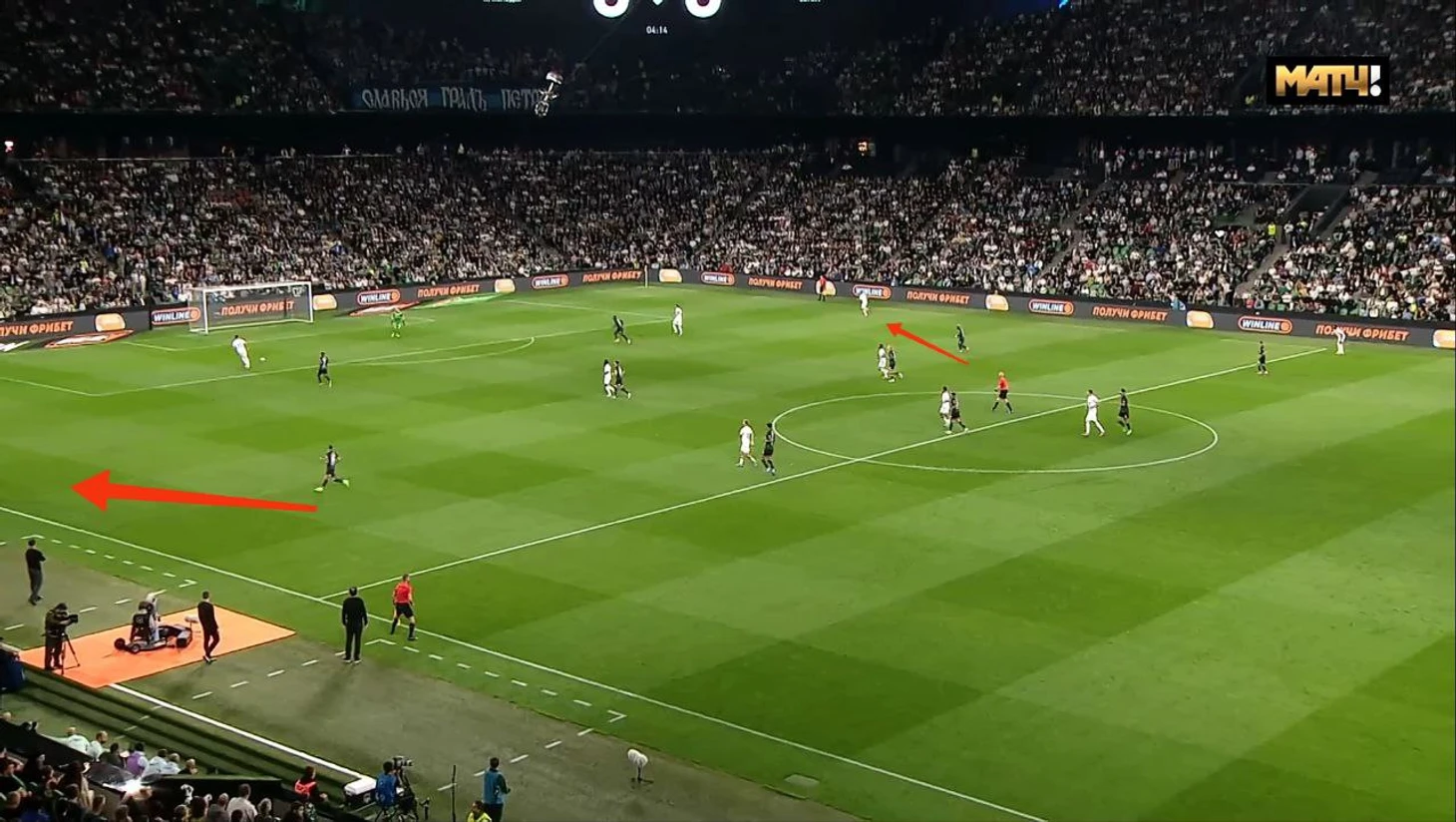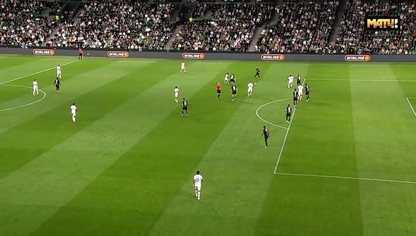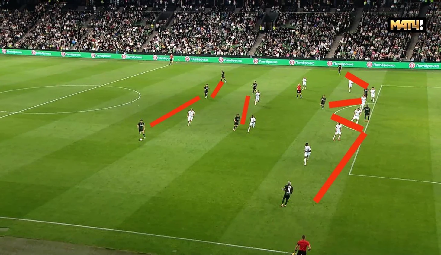 Хотя вру, пару раз «Зенит» всё же пробовал встречать высоко. Тут ничего интересного – базовая расстановка. Я вообще считаю прессинг в 4-2-3-1 крайне неэффективным из-за отсутствия оппонента у одного из цз, но какая разница, если ставку на давление штаб Семака не делал?