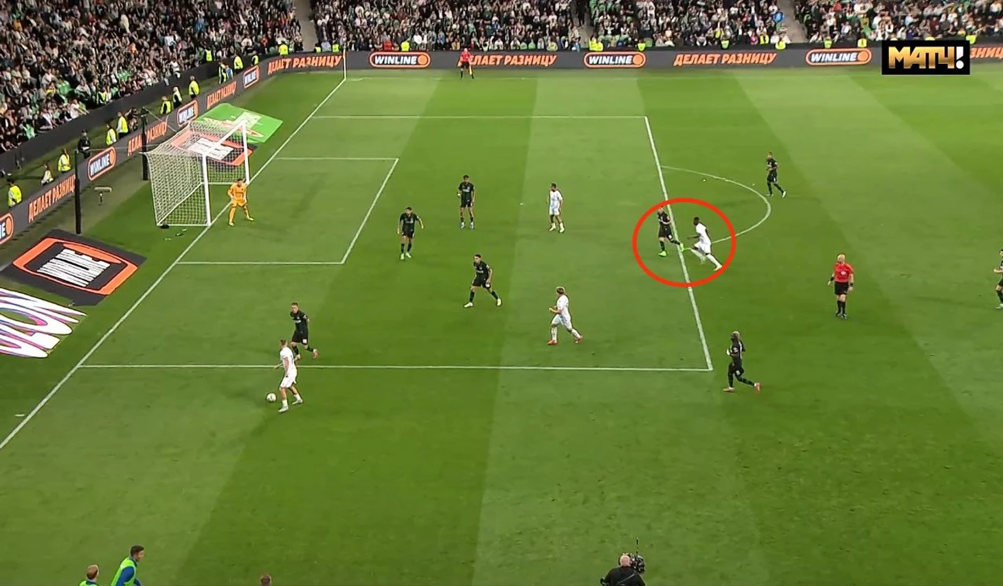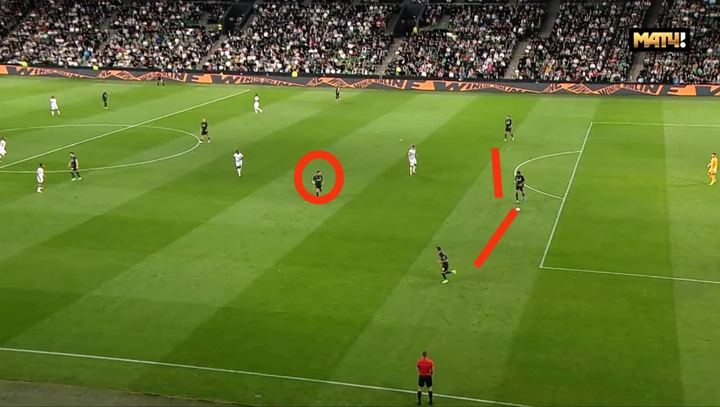 А вот одним из немногих постоянств в обороне «Зенита» были персональные ориентировки полузащитников при мяче в центральной трети. Зачем? Я и сам не понял: держались персоналки только в центре, иногда кто-то бросал/передавал своего игрока даже там, а даже если все выполняют эту установку, плотности для того, чтобы доставить сопернику проблемы, не хватало. Совсем незначительная деталь, но я сегодня разбираю всё, что только нашёл.