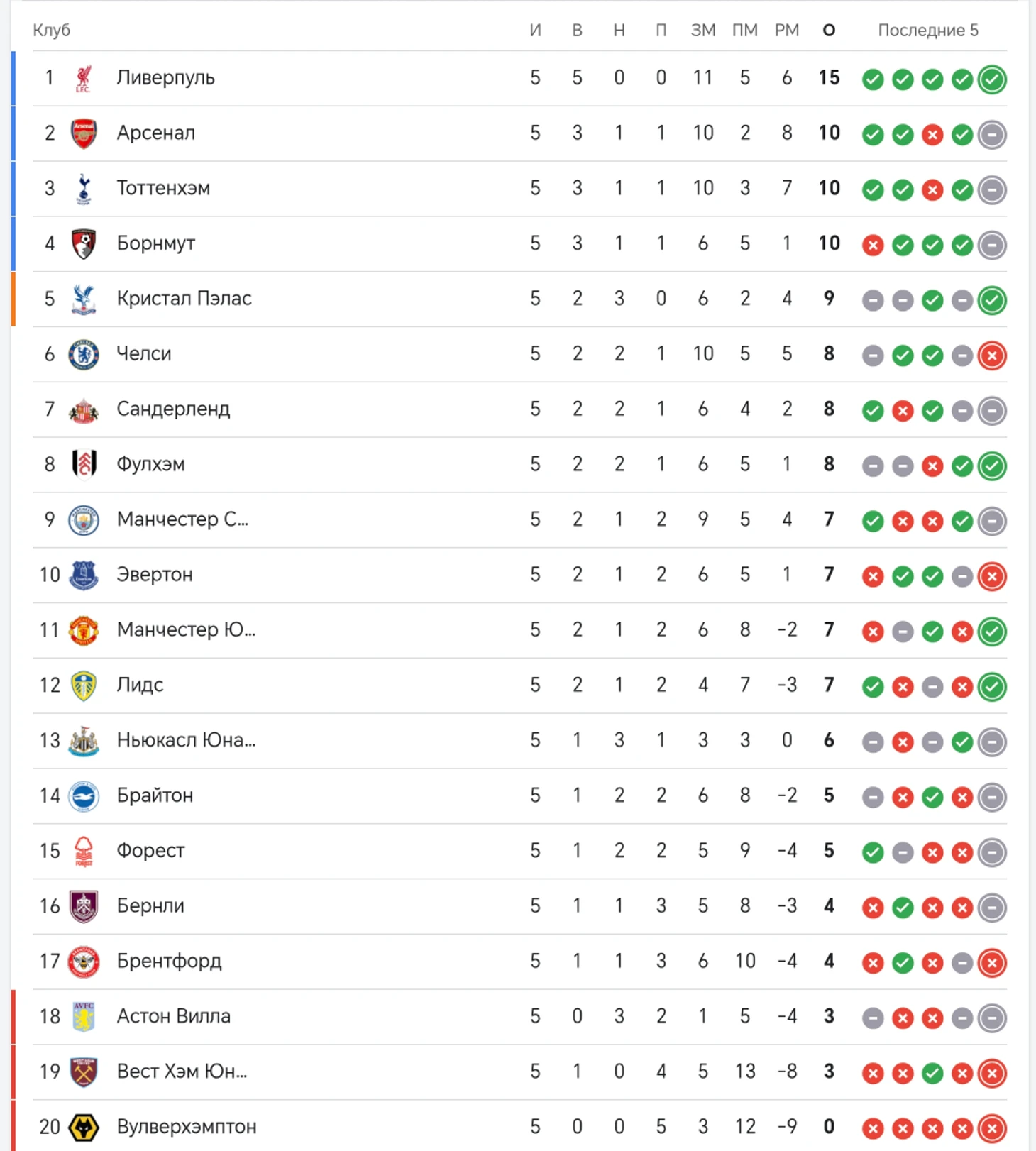 Вот и прошел первые пять туров АПЛ. Можно подвести начальные итоги, кто и как оказался готов к первым турам.