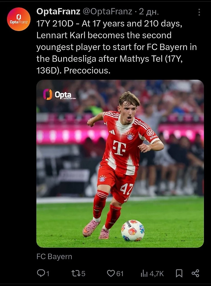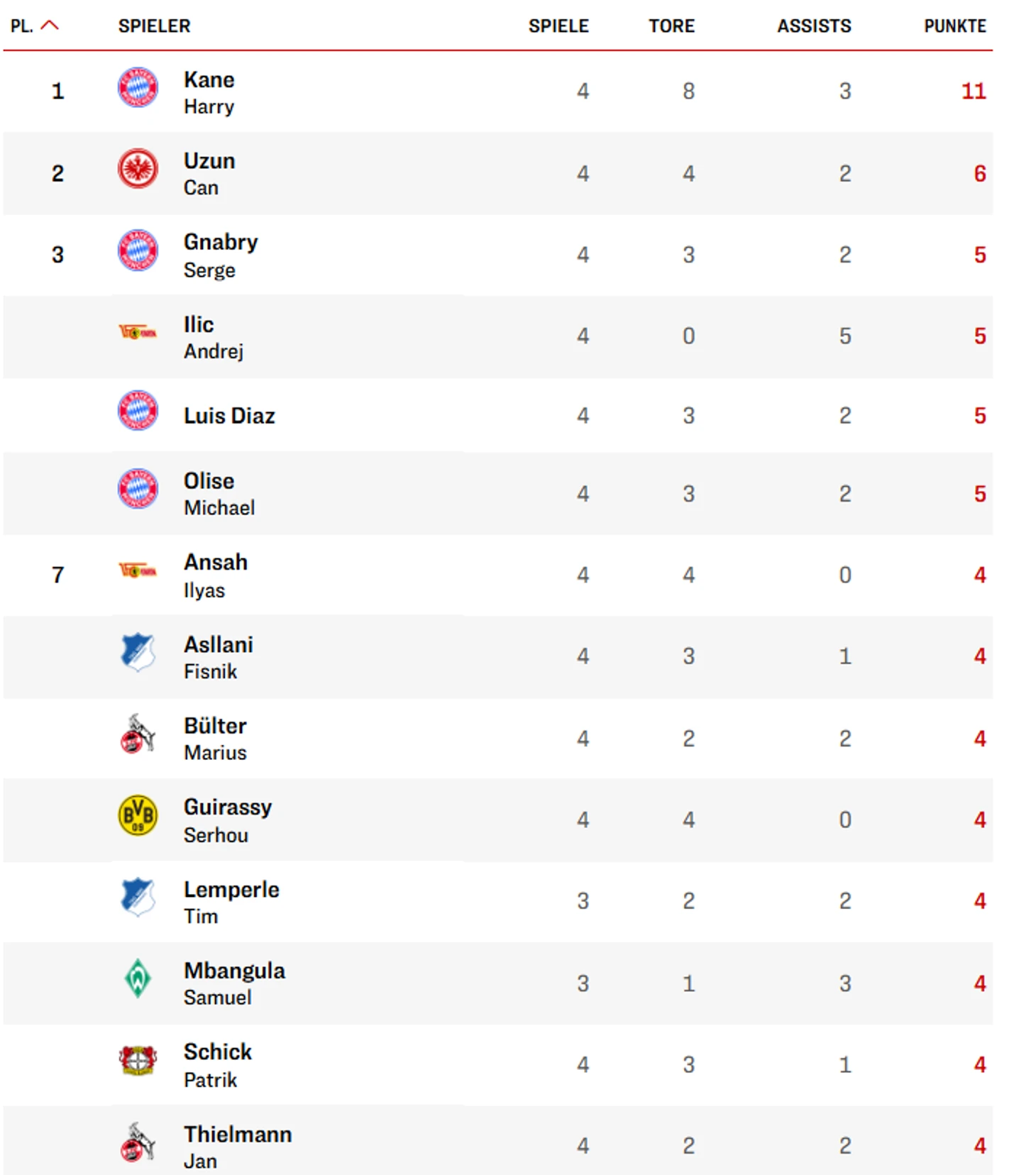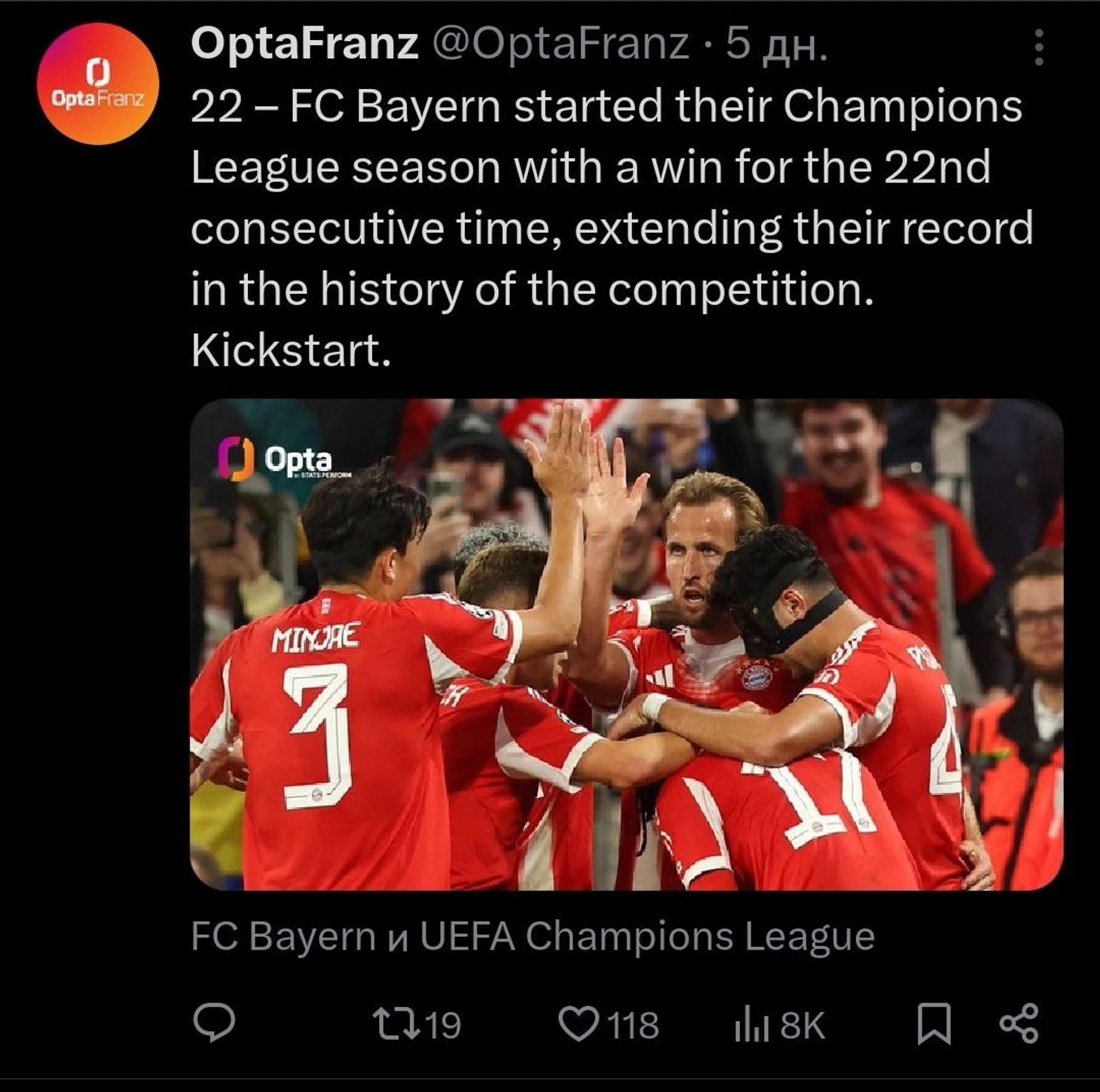 В первом туре Бундеслиги мюнхенцы дома катком прошлись по «РБ Лейпцигу». Взяв почти полчаса на раскачку, с 27-й минуты голы в ворота Гулачи полетели один за другим. До перерыва дубль сделал Олисе и отличился Диас, во втором тайме Кейн оформил хет-трик. Итог: 6:0 и мюнхенцы сразу делают себе такую разницу забитых и пропущенных, чтобы с их первым местом никто не мог поспорить уже после стартового тура.