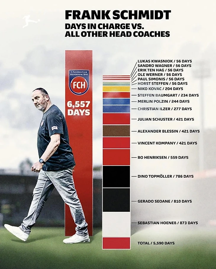 Новый сезон в немецкой элите, новая борьба за выживание для «Хайденхайма». Зато команда верна своим людям: на старте кампании Франк Шмидт зафиксировал 6 557 дней или 17 лет 11 месяцев и 13 дней у руля «Хайденхайма» – больше, чем все его коллеги суммарно провели в нынешних клубах.