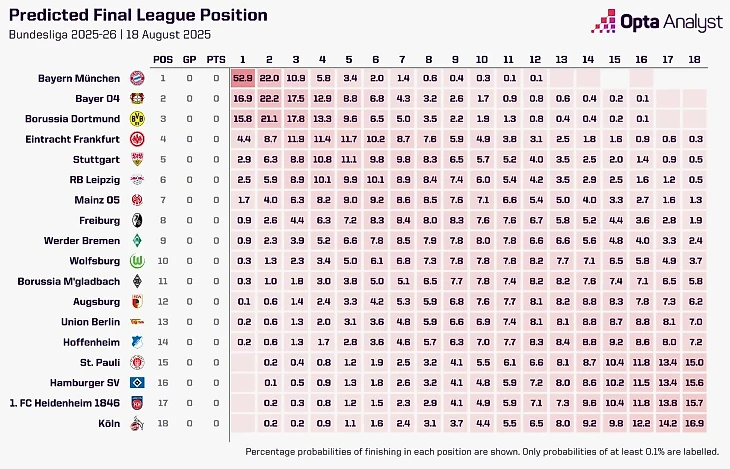 У Opta уже готов прогноз на сезон: «Бавария» – чемпион с вероятностью в почти 53%, а «Кельн» портал отправил назад во второй дивизион.
