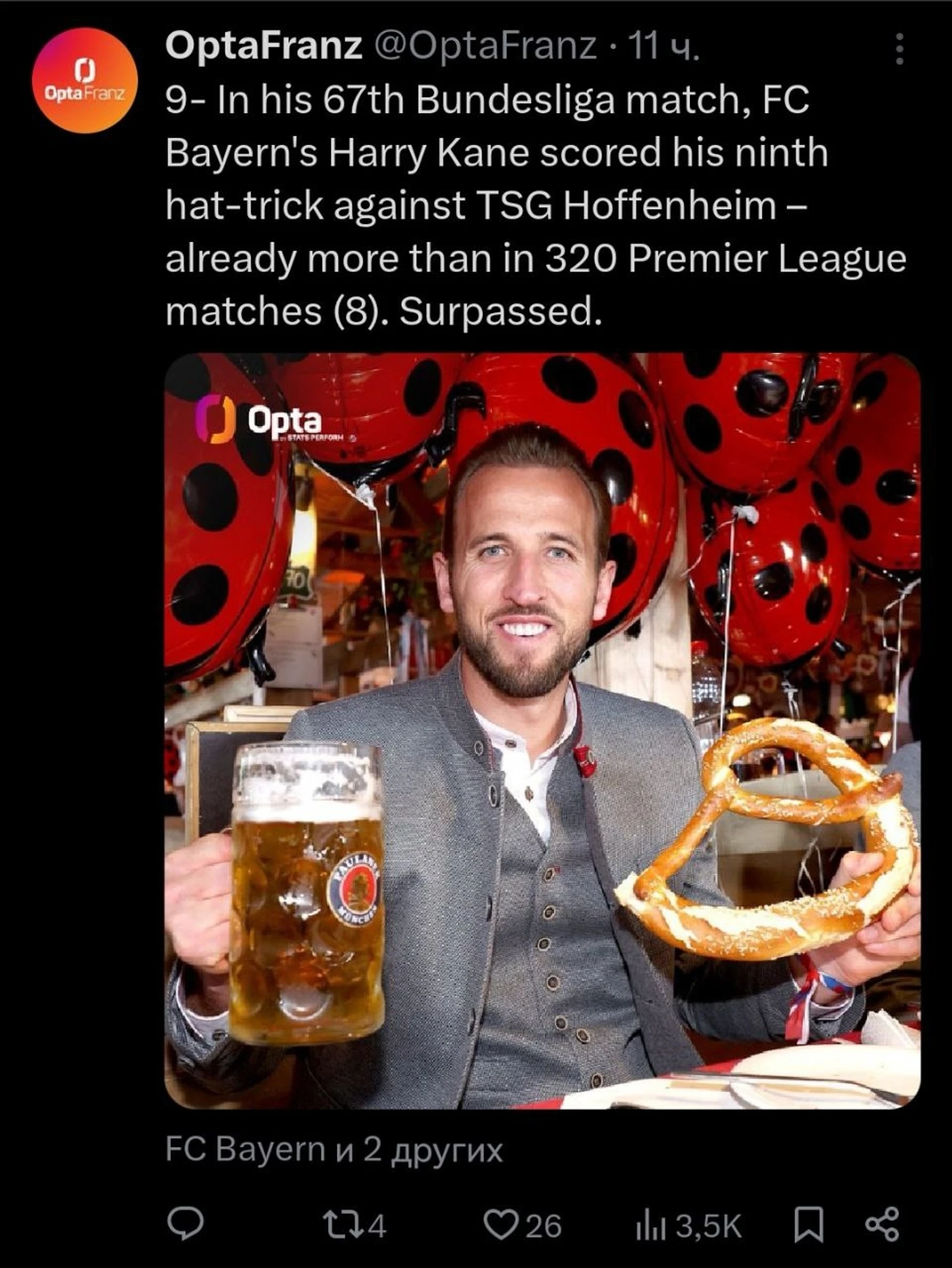Но после перерыва дело пошло гораздо легче: Кейн забил еще два и снова ушел с поля с хет-триком, еще гол забил Гнабри. У гостей же отличился Цоуфал на 82-й, но в игру это команду Ильцера не вернуло.