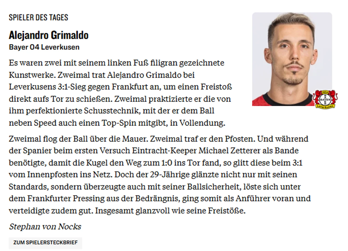 Дебют у Каспера выдался непростым, зато эмоциональным. К перерыву леверкузенцы уверенно вели 2:0 у «Айнтрахта» и, несмотря на то, что неожиданно почти отказались от владения мячом, игра вторым номером получалась у них отлично. «Орлы» не создали за первый тайм буквально ни одного момента, тогда как «аспиринщики» активно кусались контратаками. Вдвойне странно в свете этого, что два мяча они забили со стандартов: сперва роскошный штрафной удался Гримальдо, а под конец тайма Шик записал себе на счет очередной гол, реализовав пенальти.