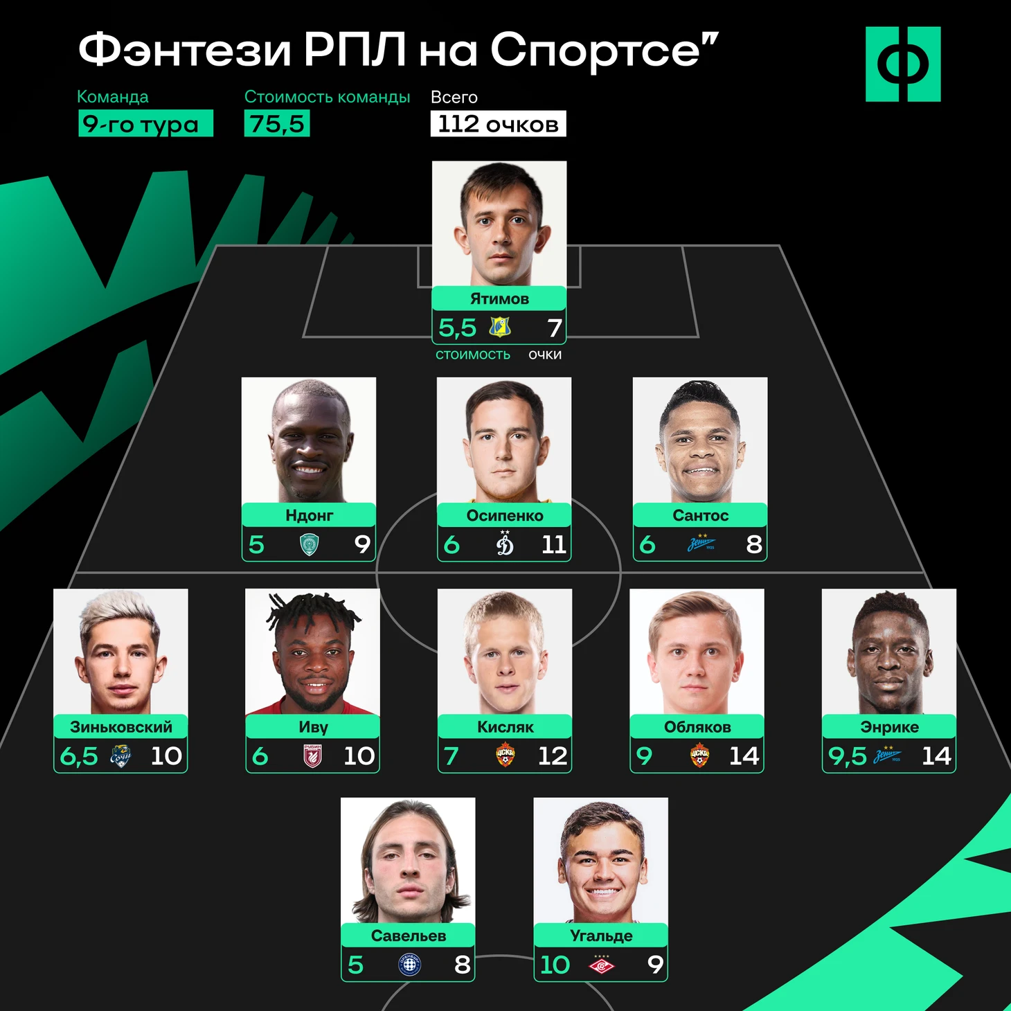 Перед вами сборная 9-го тура фэнтези-турнира по РПЛ: