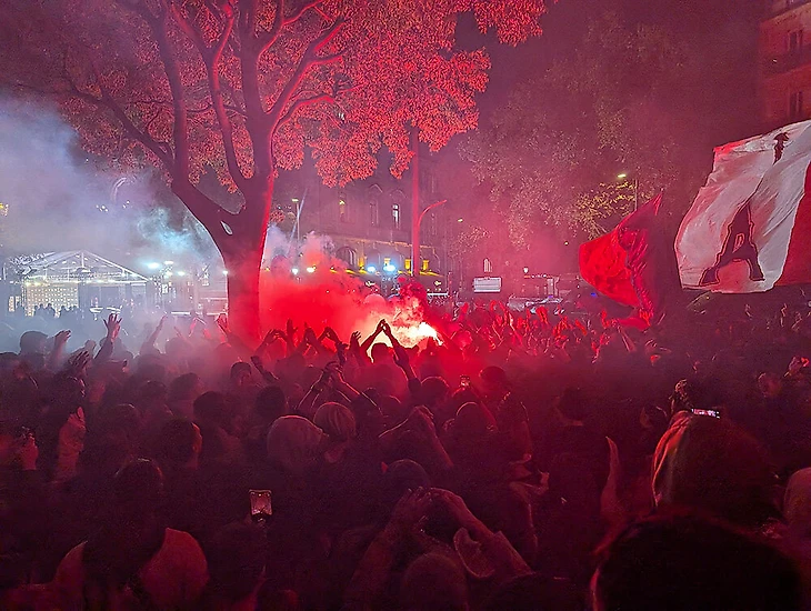 Постепенно толпа становилась больше, поэтому к моменту выхода Усмана с трофеем людей было уже очень много. Жгли файеры, запускали фейерверки, размахивали флагами «ПСЖ».