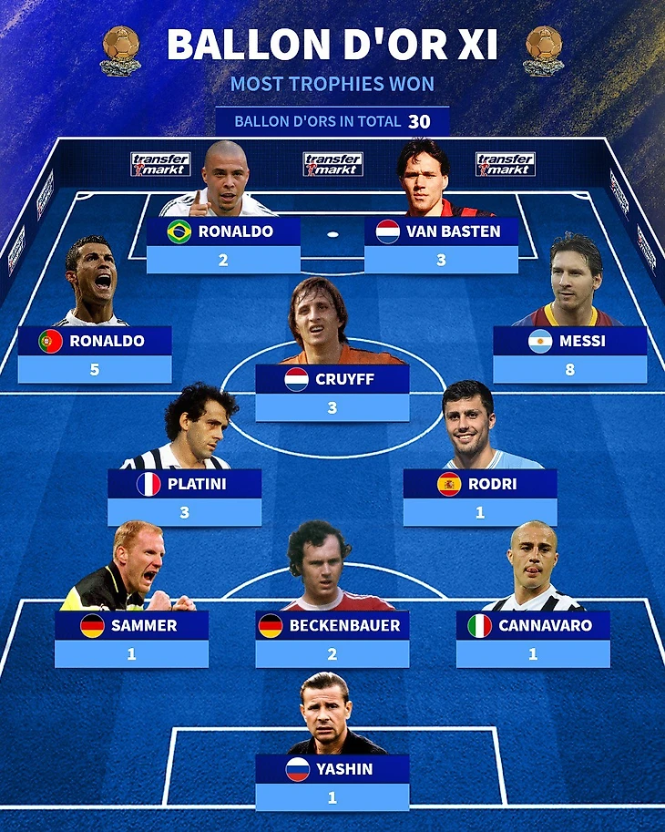 Transfermarkt составил символическую сборную обладателей «Золотого мяча» с наибольшим количеством наград. Поскольку игроки чаще получают один приз за карьеру, на некоторых позициях была конкуренция.
