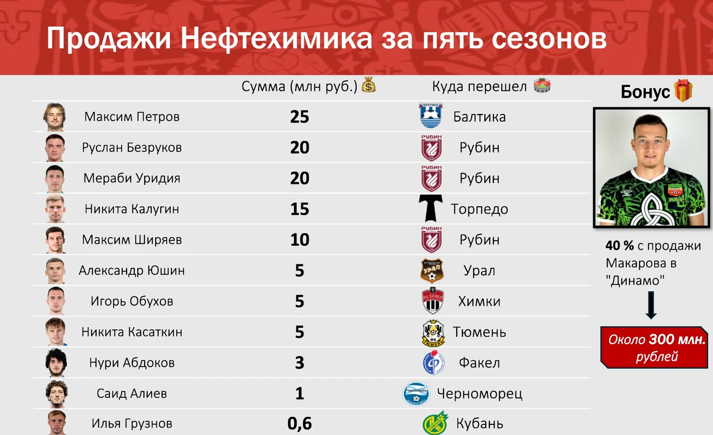 Как бы Новиков не изощрялся, не искал игроков, «Нефтехимику» нельзя расходовать не единой лишней копейки. По данным того же «Трансфермаркета» клуб тратился лишь на компенсацию паре молодых игроков, только коуч заявлял в том же 2023 году, что клуб «последние 4 года не потратил ни одного рубля (на трансферы)». Поверим скорее тренеру, да даже если тратился, то это капля по сравнению с прибыли пришедшей с продаж.