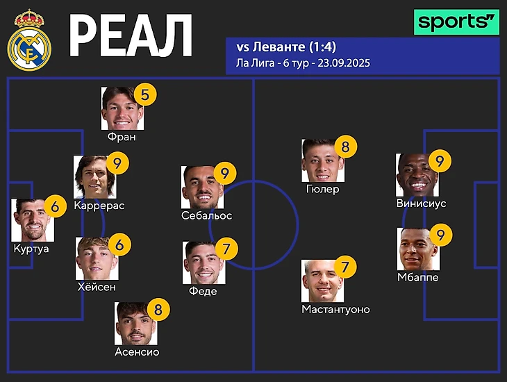 Килиан Мбаппе – 9. Ну и чудеса творятся: Хаби Алонсо заставил француза не только пахать в прессинге, но совершать рывки в атаке для освобождения зоны партнерам. В первом тайме таких эпизодов было особенно много – Гюлер, Вини или Франко получали свободу за счет своевременных рывков Килиана за спину защитникам (те реагировали). Год назад он бы просто не двигался и ждал бы передачу в ноги. Прекрасная работа на команду и дубль – это автоматом высокая оценка. Хотя и нельзя не отметить, что с мячом в ногах Килиан допускал многовато брака.