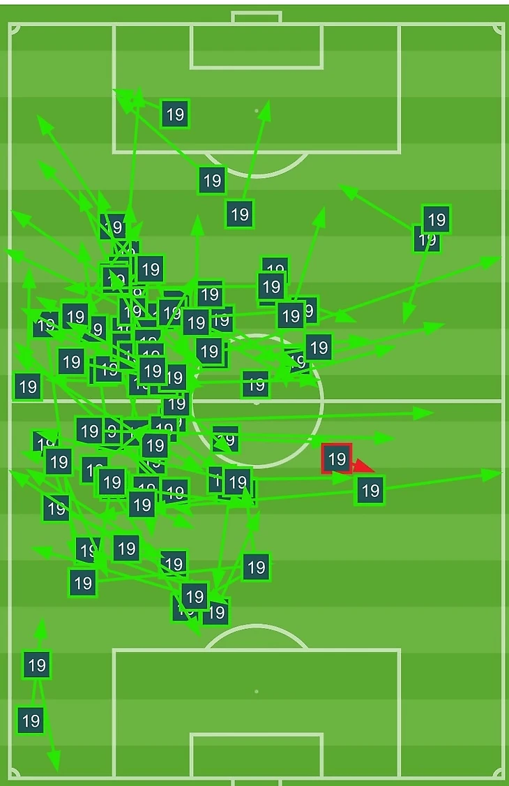 Отдельно хочу отметить очень сильную игру Дани Себальоса – он был одним из ведущих игроков в контрпрессинге и великолепно играл на мяче. Так выглядит его карта передач в матче с «Леванте» – всего один неточный пас при 90 попытках.