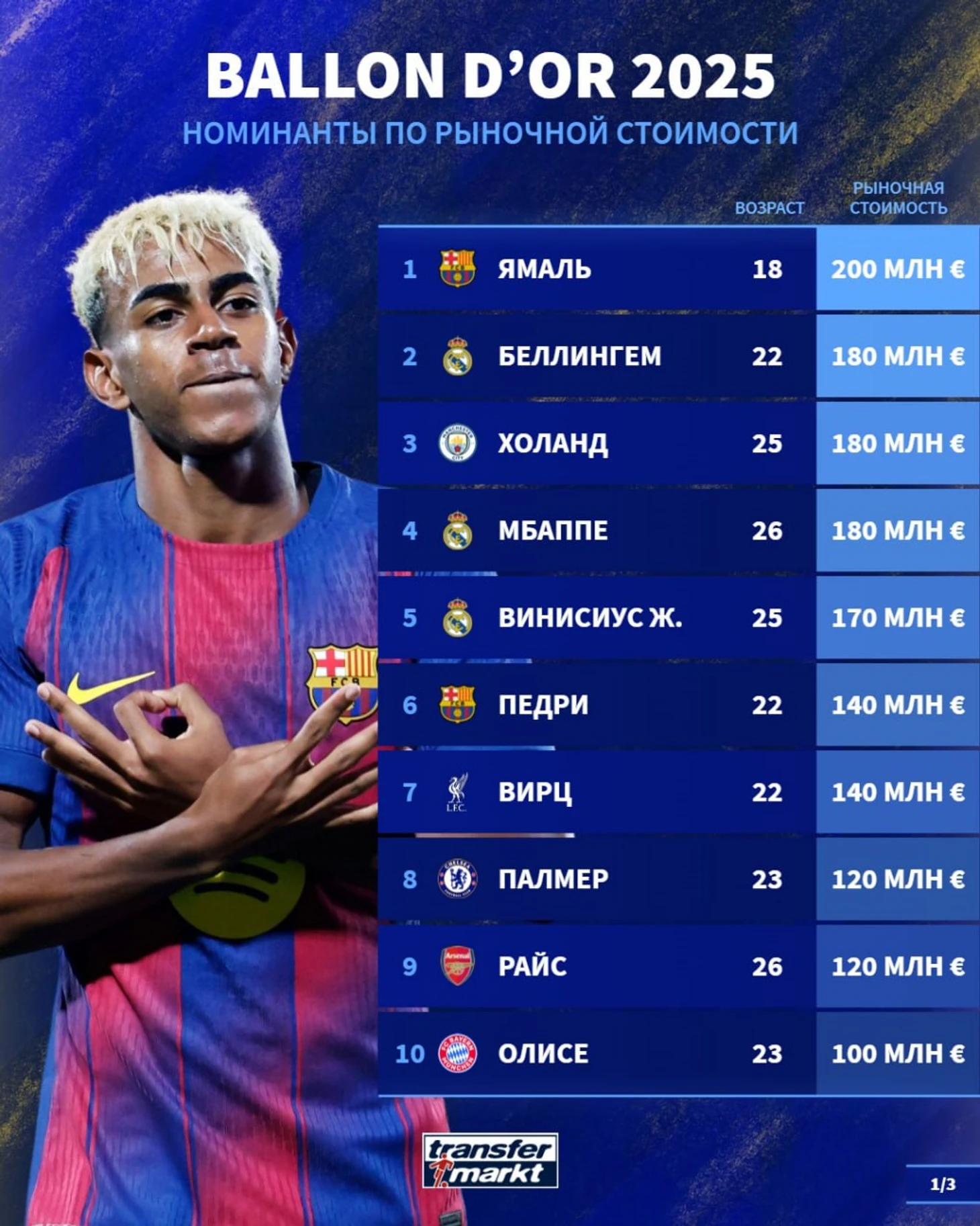 Забавно, что если бы всё решала рыночная стоимость игроков, то ни одного представителя «ПСЖ» не было бы в ТОП-10! Вот как выглядит список самых дорогостоящих номинантов на «Золотой мяч»: