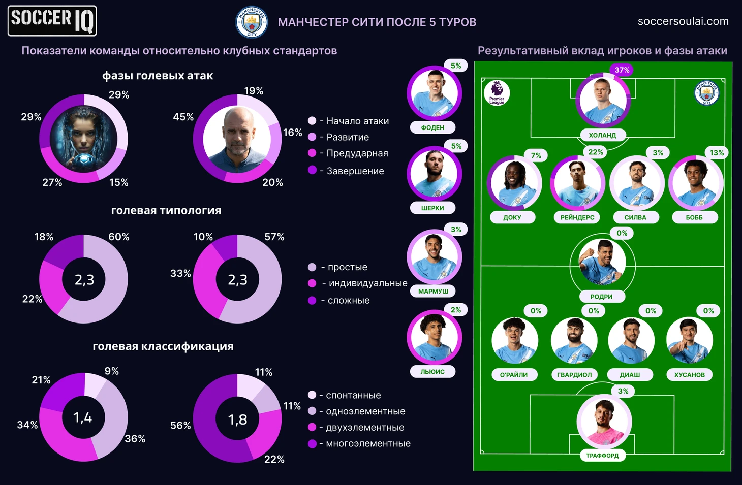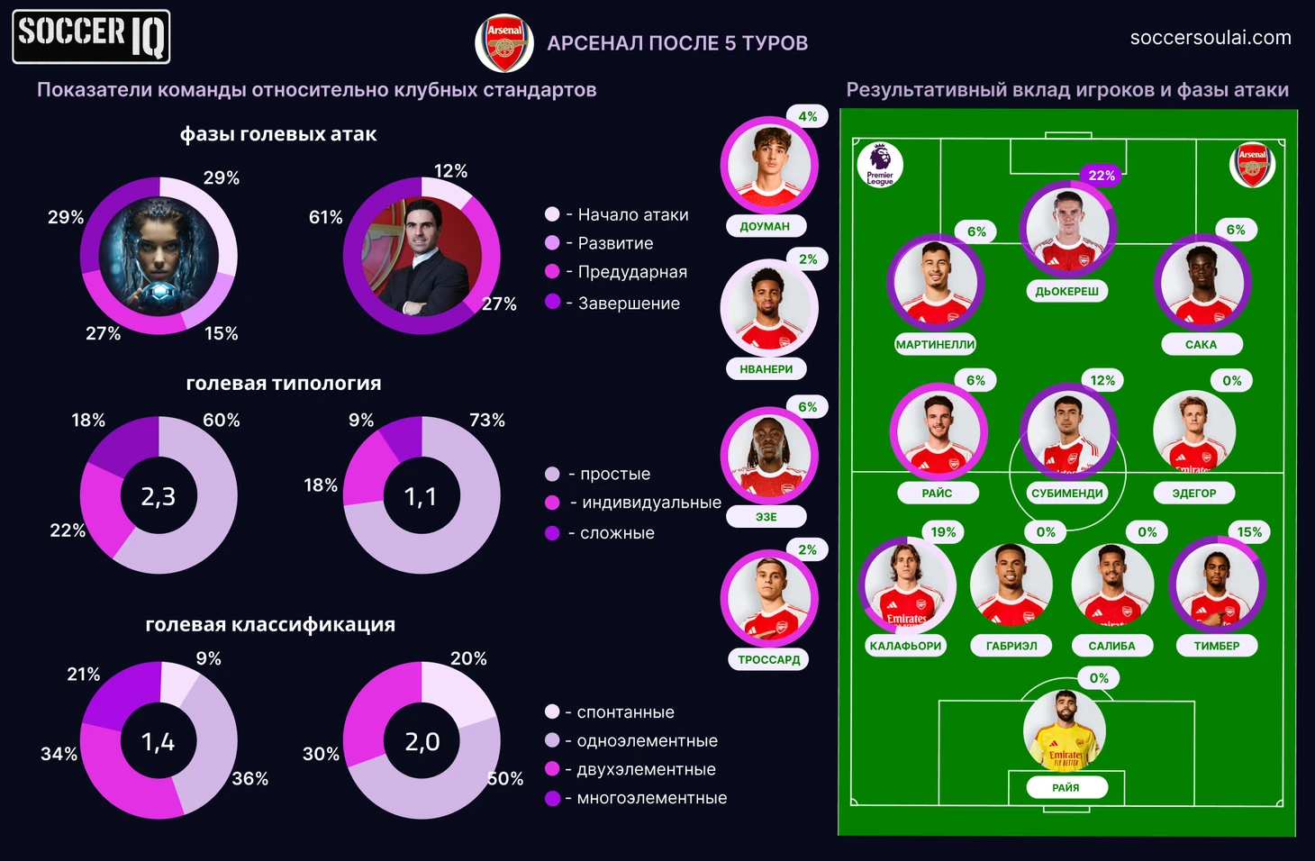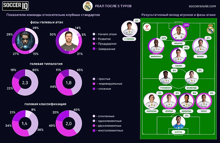 Лаборатория Soccer IQ в свою очередь провела разбор каждой из команд-фаворитов и через призму собственного метода выявила основные показатели клубов, касающиеся их результативности: как команды забивают и кто из футболистов имеет наибольшее влияние на результат в рамках игрового отрезка с 1 по 5 туры национальных чемпионатов?