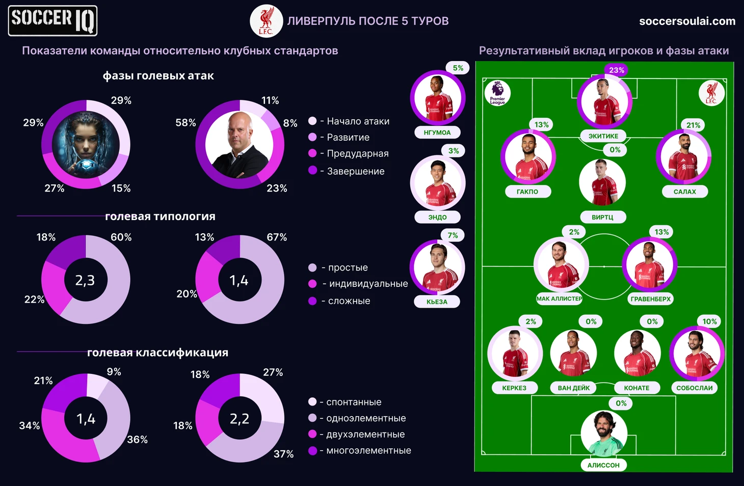 Чем хорош Ливерпуль Слота на старте сезона, кроме того, что имеет наибольшую долю результативных сложных ситуаций (13%)? Тем, что по многим метрикам команда где-то наверху: второй показатель доли многоэлементных голевых атак, второй показатель фазы развития голевых комбинаций (8%), отражающий глубину атаки и т.д. Статистически, в сравнении с соперниками, Ливерпуль не проседает заметно нигде.