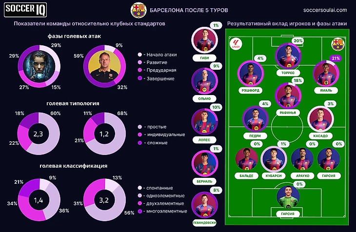 Ямаль (21%) и Ферран Торрес (20%) – игроки с максимальным результативным вкладом. Не сильно отстал Рафинья (18%), а подборка эффективности игроков, являющихся на старте сезона скорее игроками усиления (Фермин Лопес, Ольмо, Левандовски) – всем на зависть!