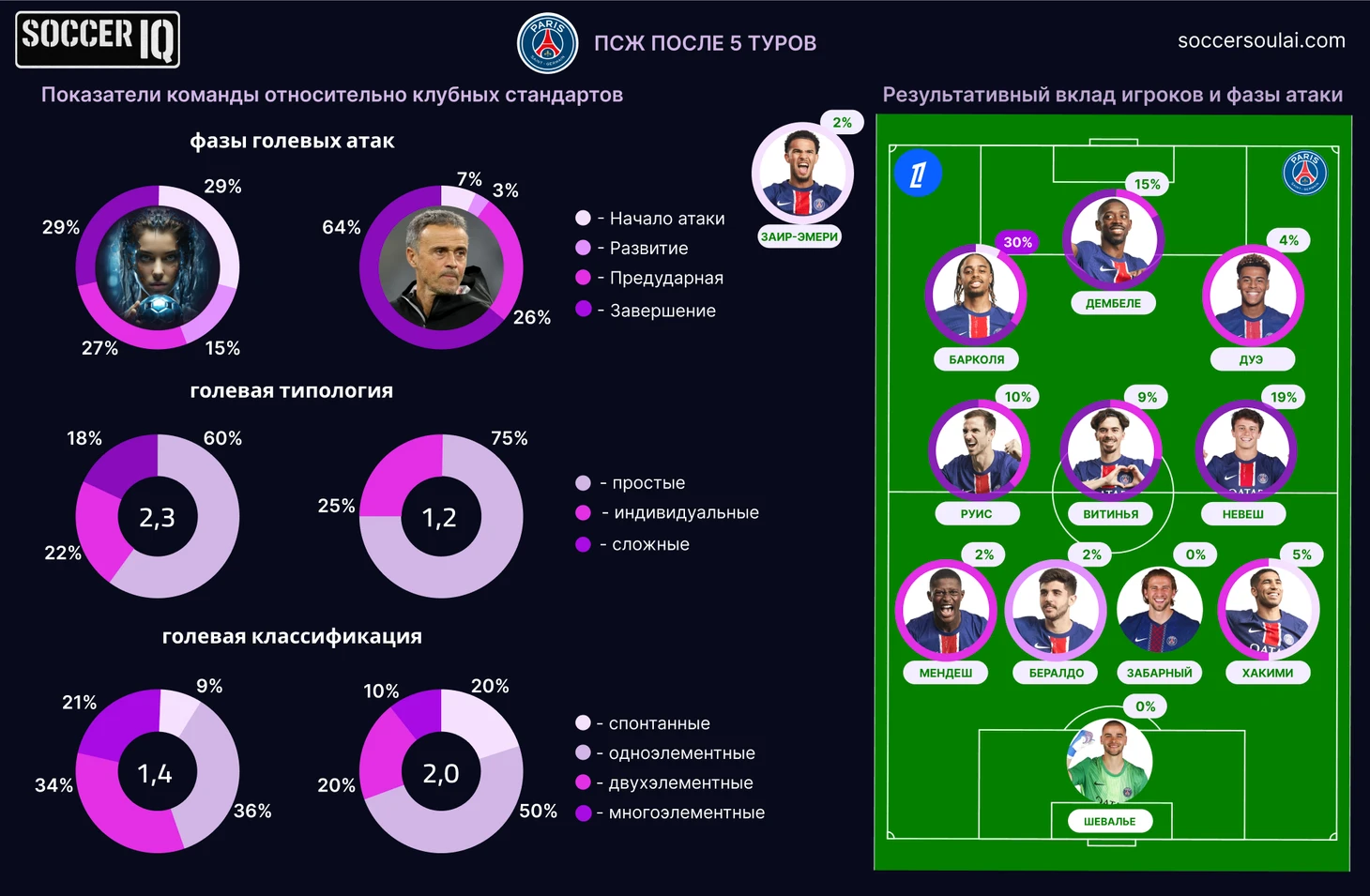 В целом, цифры ПСЖ пока выглядят непривычно. Нулевая эффективность Кварацхелии тоже своего рода сюрприз. При этом у парижан наиболее активная средняя линия, где Невеш, Руис и Витинья дали 38% в общий результат только за счет предударной и ударной фазы.