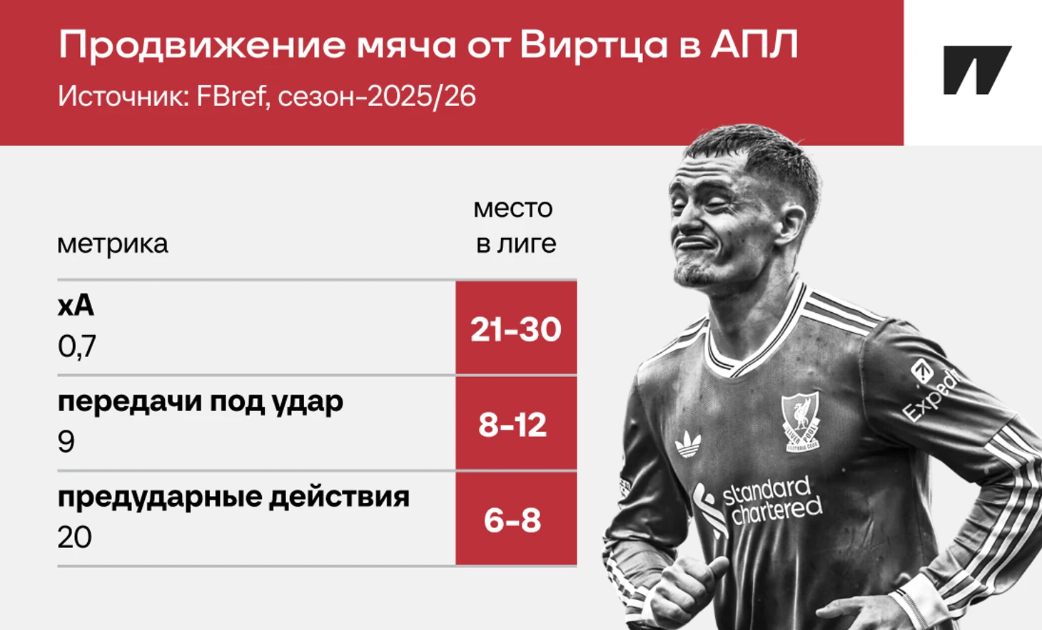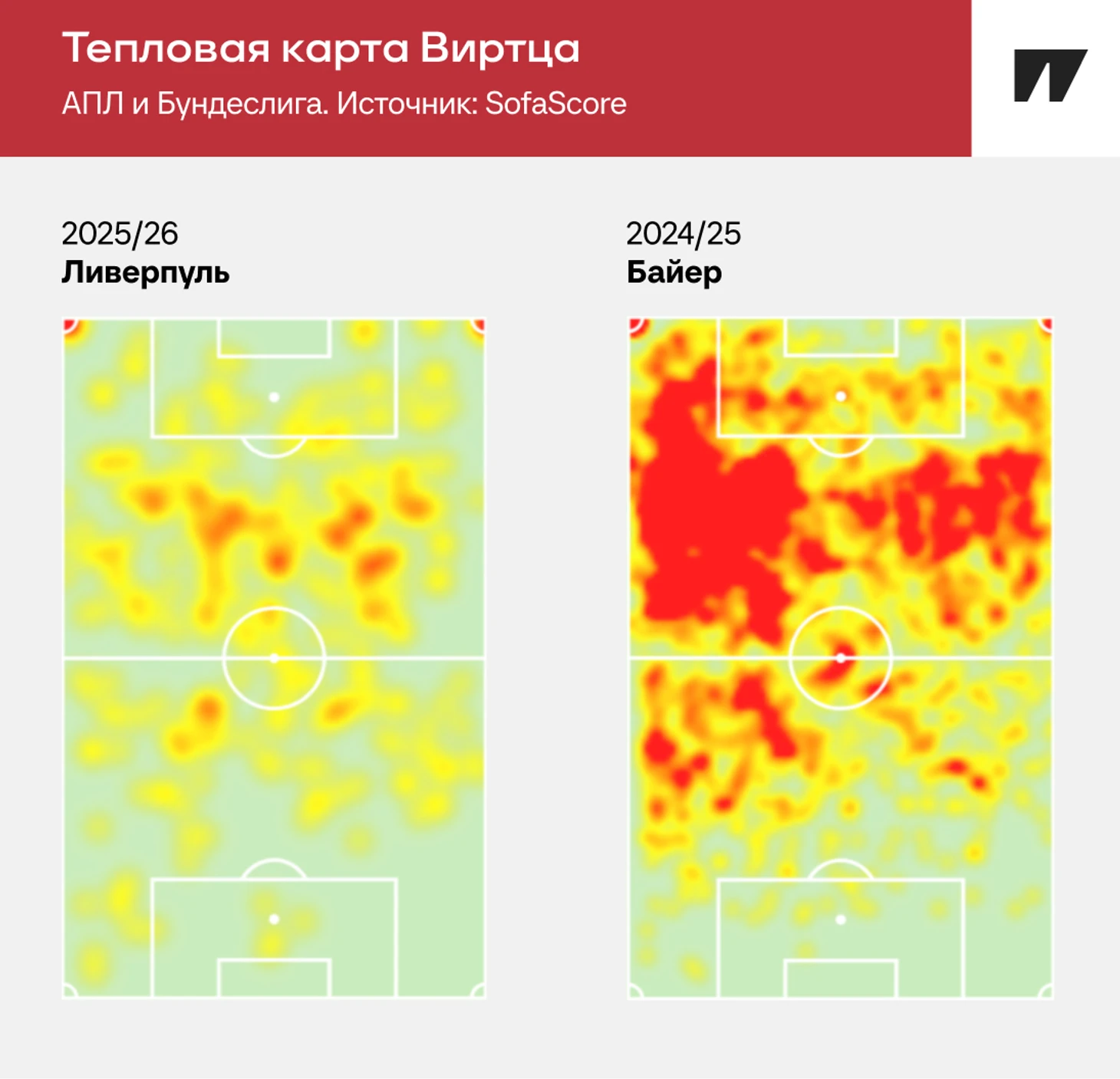 Все это касается и поиска моментов для удара. Виртц пока нестабилен: против «Ньюкасла» и «Арсенала» совершил всего пять действий в штрафной (впрочем, это одни из лучших оборон в лиге).