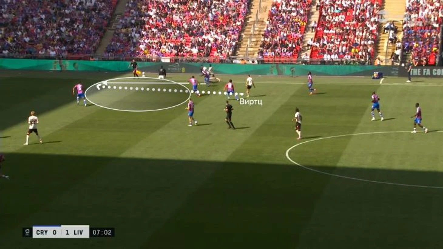 Здесь Виртц воспользовался высокой позицией левого латераля «Кристал Пэлас» Тайрика Митчелла и вывел на прострел Фримпонга.