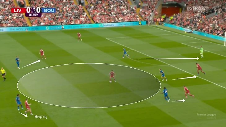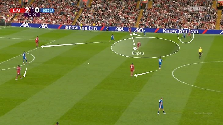Еще похожие открывания проходят после смены позиций в начале атаки. Против «Борнмута» Виртц опустился в опорную зону, а Мак Аллистер увел Тайлера Адамса на фланг.