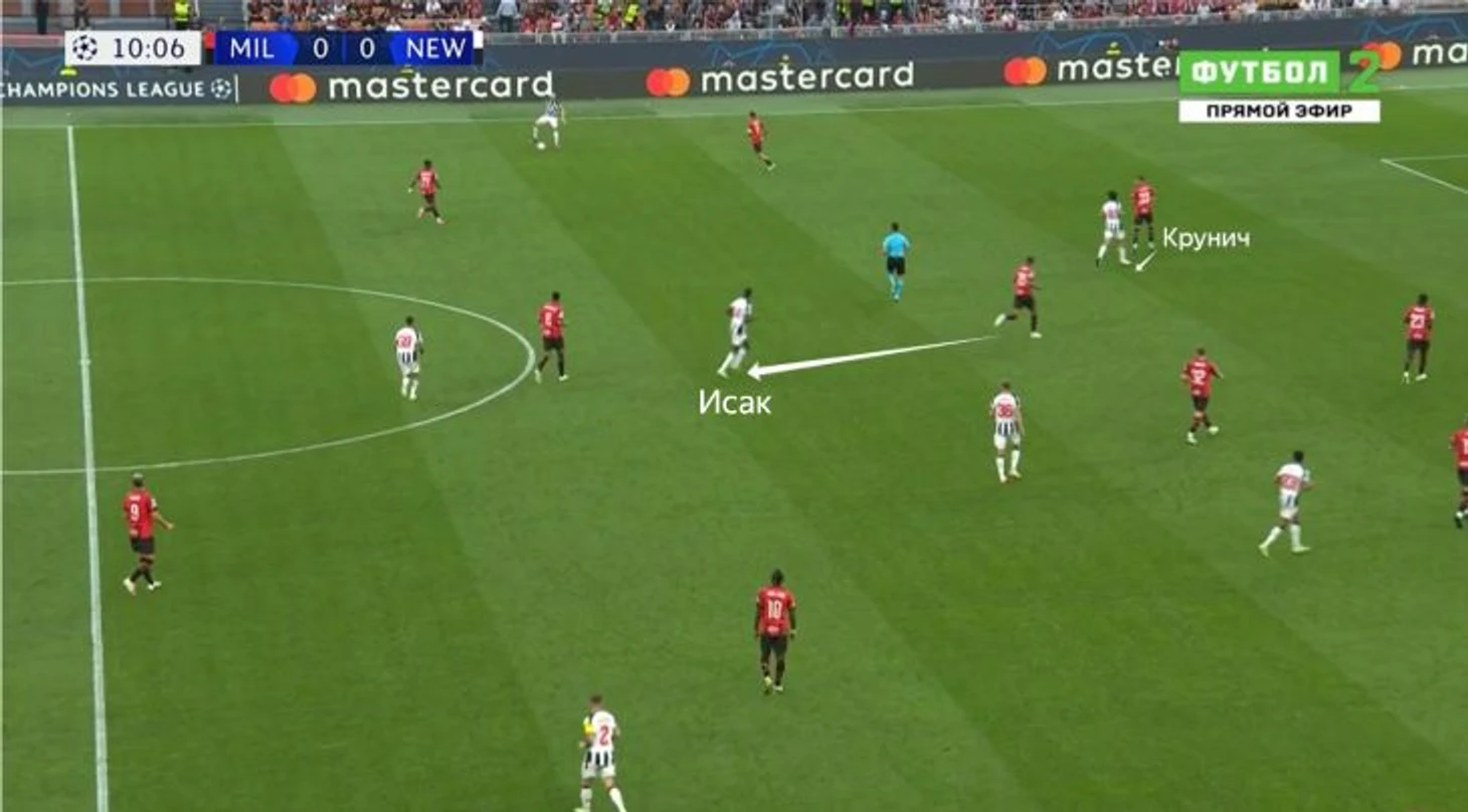 В «Ньюкасле» Исак регулярно отвлекал внимание и создавал пространство для партнеров. Против «Милана» в ЛЧ выдернул Малика Тиава, а ему за спину рванул Сандро Тонали. Раде Круничу пришлось оставить опорную зону и опуститься в оборону.