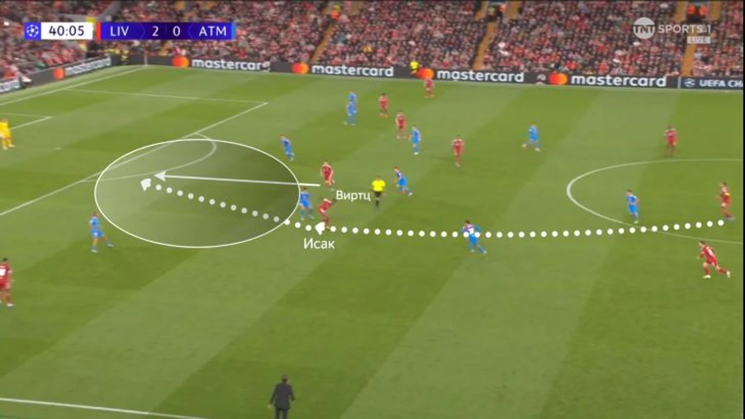 Партнеры этим пользуются и врываются в свободную зону. Самый яркий пример – гол Юго Экитике «Борнмуту», когда Виртц увел Адамса и позволил форварду выйти на простор для рывка.