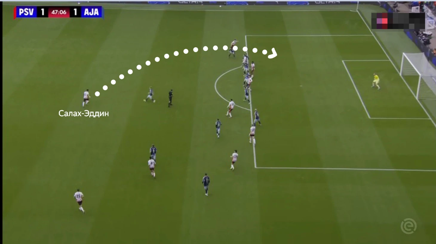 Салах-Эддин на регулярной основе смещался в центральную зону при розыгрыше мяча. Крайний защитник не просто присутствовал на месте опорника и не использовался в целях манипуляции персональным прессингом соперника. Новичок ПСВ был частым адресатом в развитии атак. Защитники Гасьоровски и Фламинго активно пасовали на «непрофильного» опорника. Только Джоуи Верман (буквально глава ЦУП ПСВ на поле) и Серджиньо Дест чаще, чем Салах-Эддин, отдавали продвигающие передачи вперед.