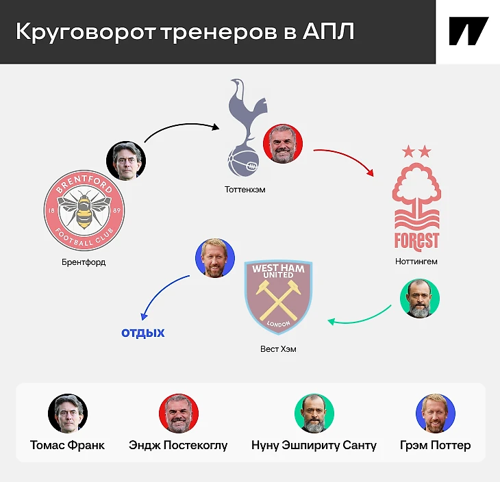 ● Нуну рассорился с «Ноттингемом». В сезоне-2024/25 португалец построил лучшую команду в современной истории клуба. Но не принял назначение Эду на пост спортивного директора, пошел на конфликт с руководством. Тренера уволили уже после третьего тура, там «Ноттингем» неожиданно влетел как раз «Вест Хэму» (0:3).