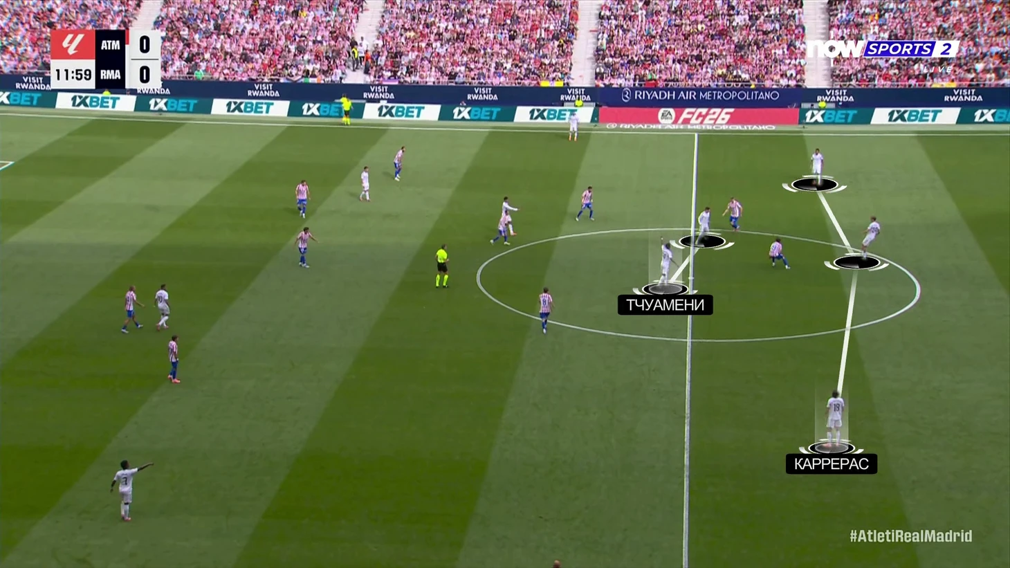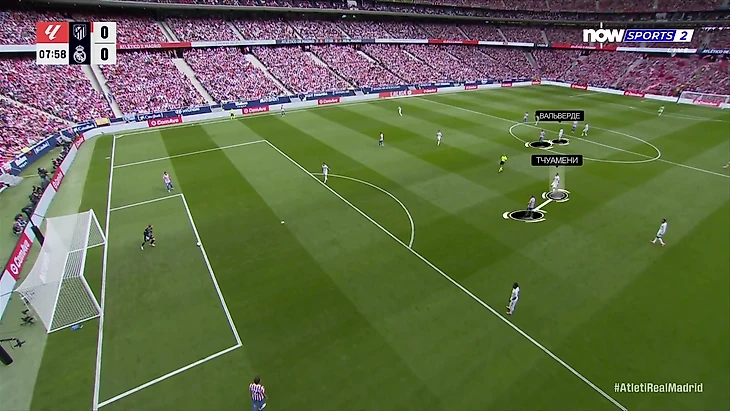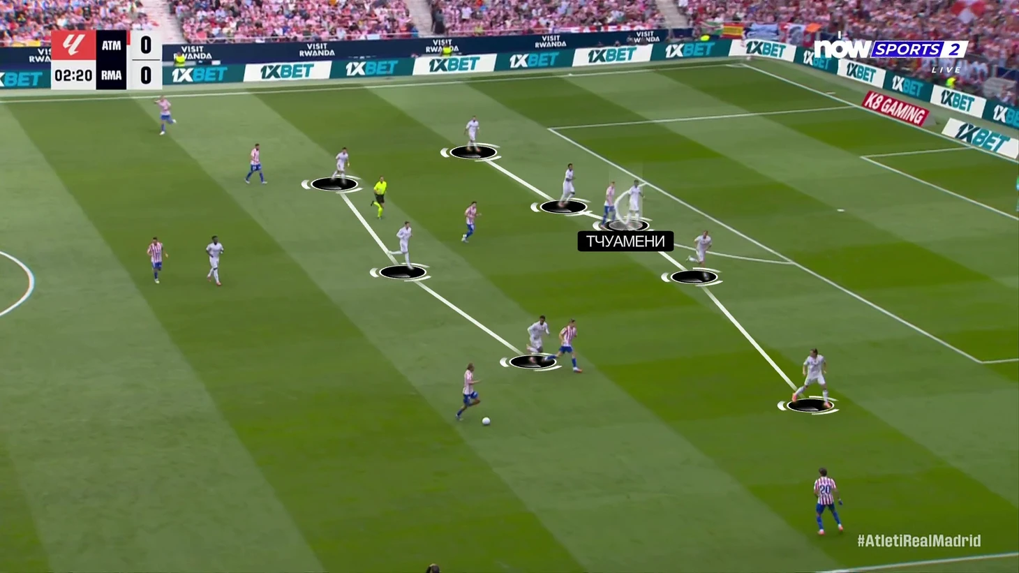 При прессинге Тчуамени поддерживал персональное давление, выдвигаясь на Пабло Барриоса, а защиту и опорную зону страховал Феде Вальверде.