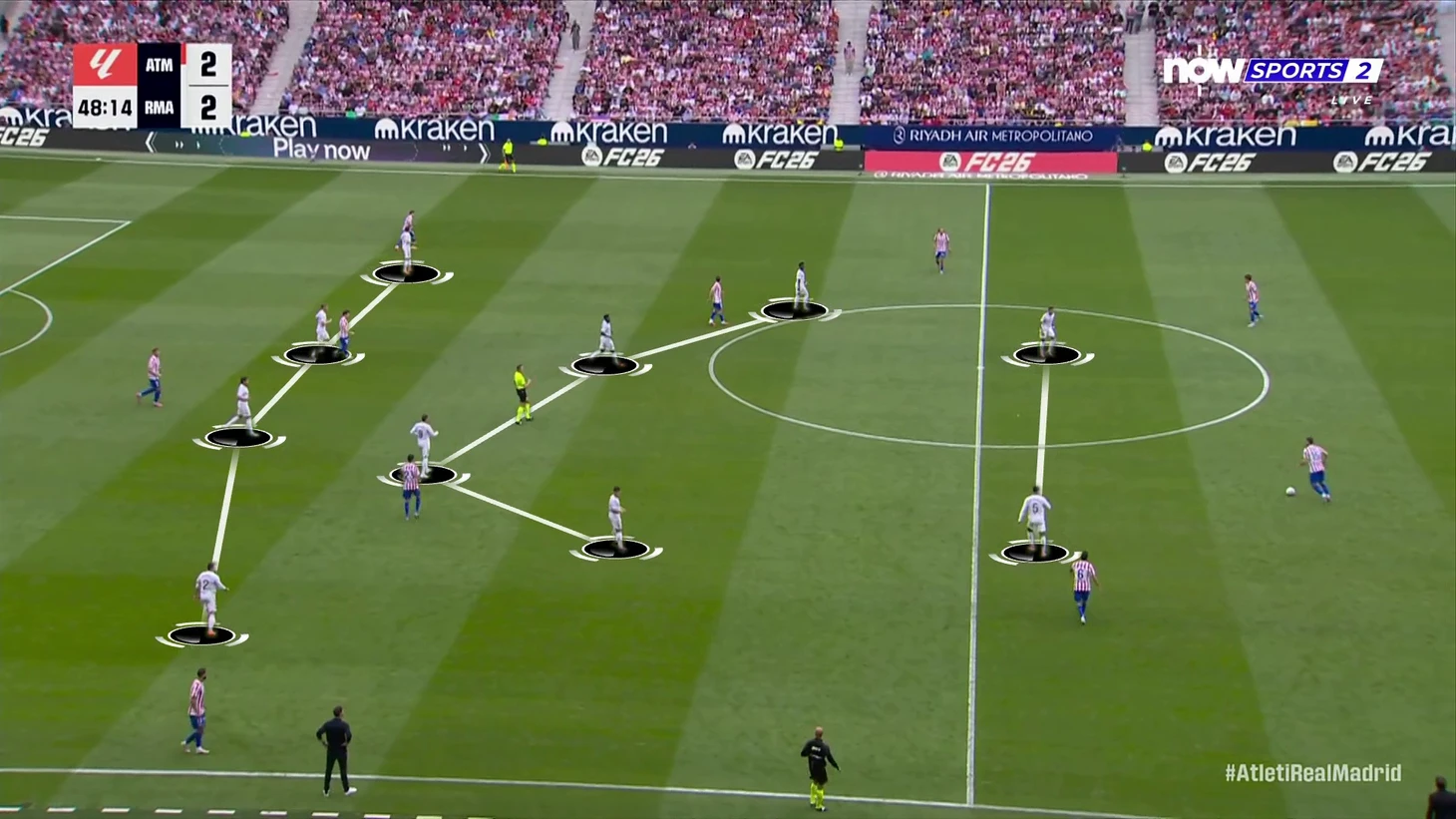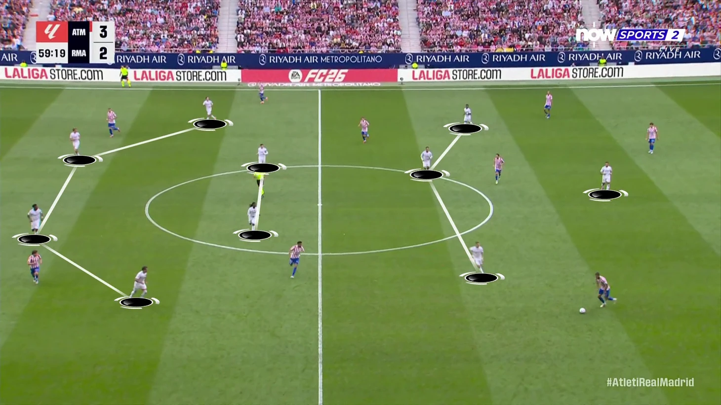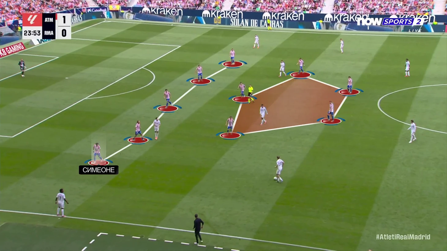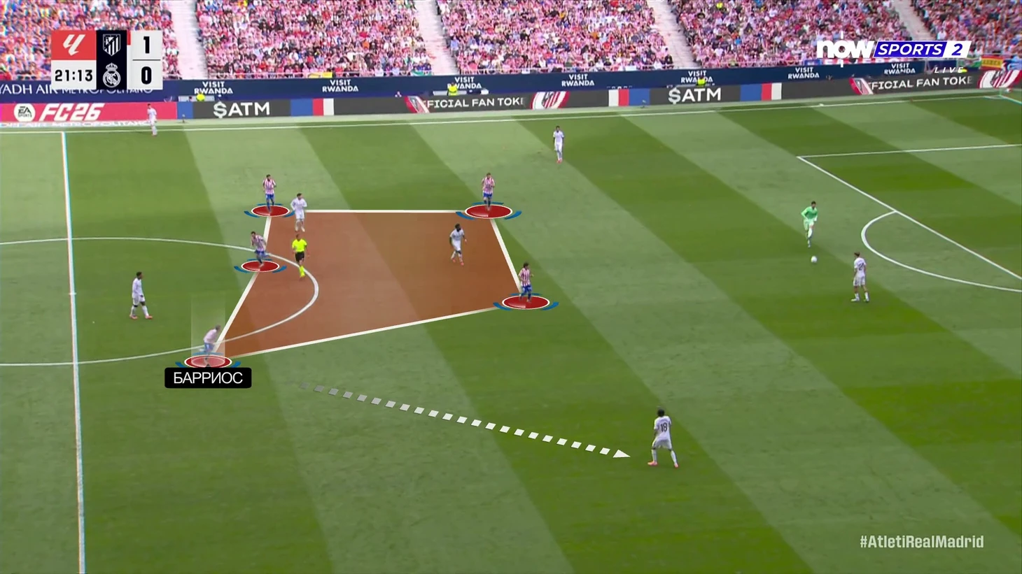 При ударах от ворот «Атлетико» использовал зонное давление в 4-1-3-2 – такое расположение изначально перекрывает центр, а потом команда смещается по мячу.