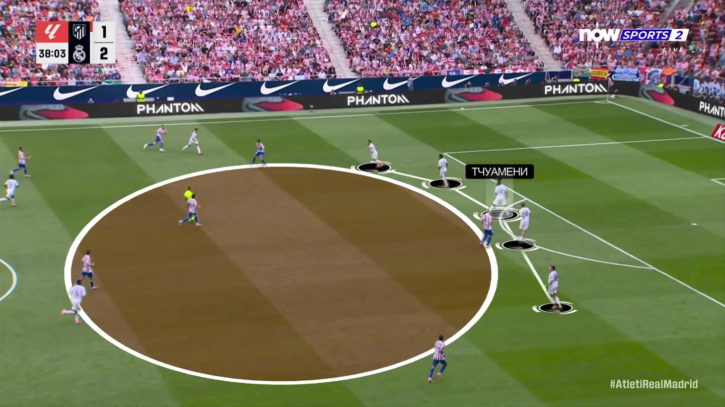 Описанный рисунок сделал трудную схему Алонсо проблемой. Например, в этом моменте в опорной зоне гигантская дыра, так как Тчуамени уже сел в защиту, а партнеры еще не вернулись.