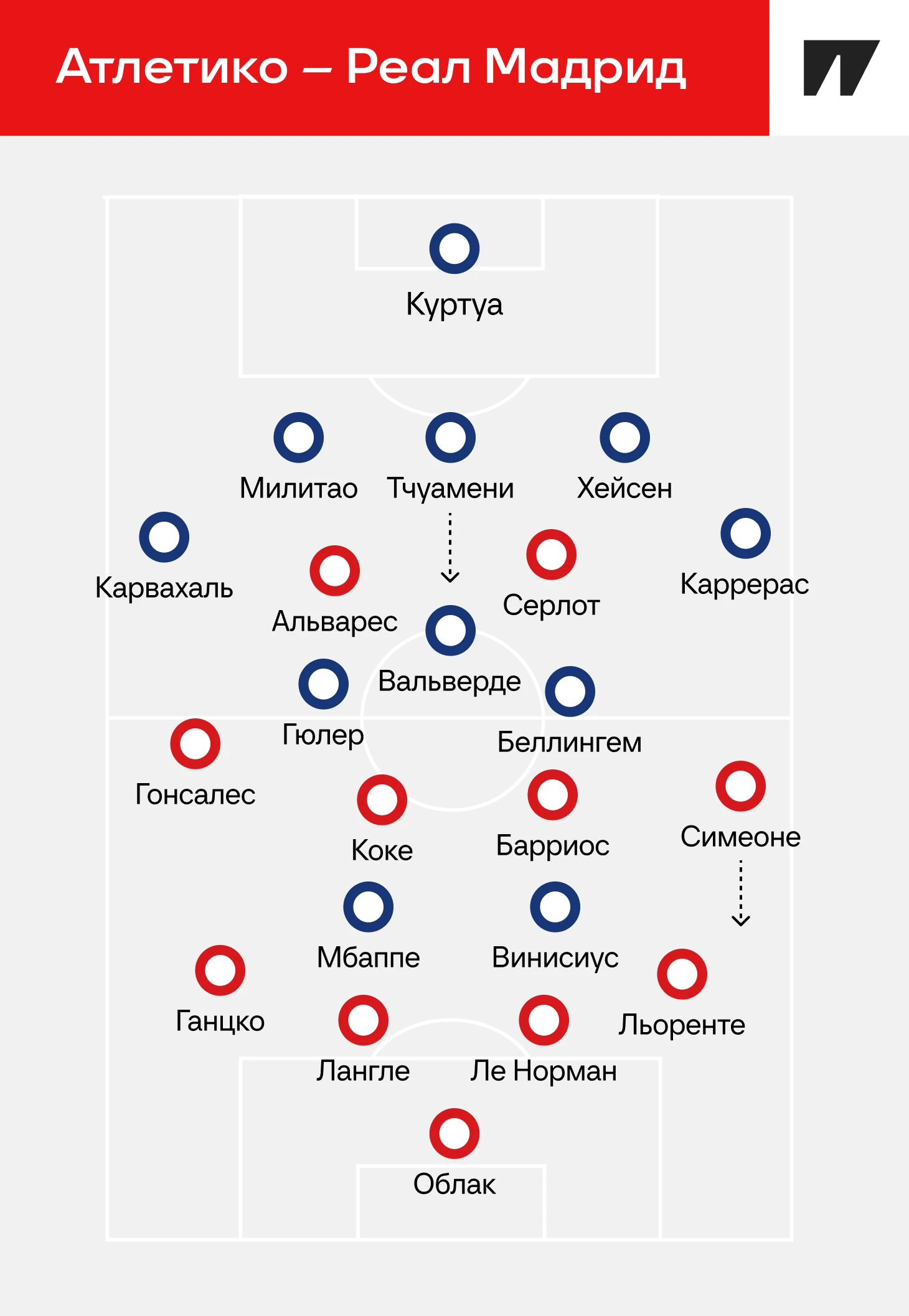 Состав «Атлетико» был максимально похож на вариант против «Мальорки» в прошлые выходные. Одно изменение: Александр Серлот в старте вместо Джакомо Распадори. Основные ходы Симеоне были связаны с акцентами внутри схемы, а не с выбором исполнителей. Хотя выход Серлота – важный маркер. Разберем его ниже.
