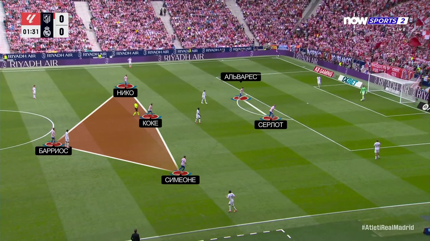 Давление «Атлетико» было блестяще организованным. Два ключевых аспекта: момент начала (зажимали, когда мяч близко к флангу) и коллективная работа в режиме высокой интенсивности. И то, и другое – на прекрасном уровне.