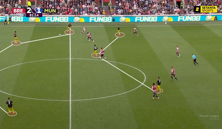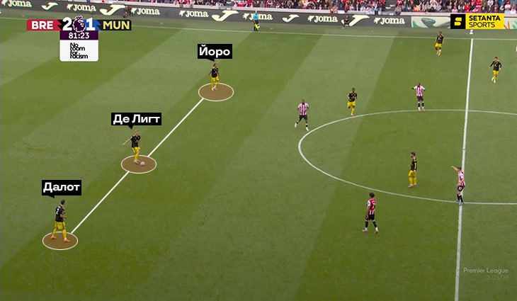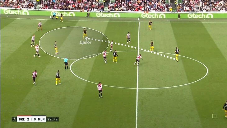 В атаке все было не настолько плохо. Рубен Аморим нащупал слабое место в обороне «Брентфорда» и пытался вскрыть зону между линиями. Несколько раз так получал пространство Матеус Кунья, но не хватало конкретики в завершении. Как и в этом моменте, когда в середину сместился Диогу Далот и остался без опеки (Беньямин Шешко пробил издали).