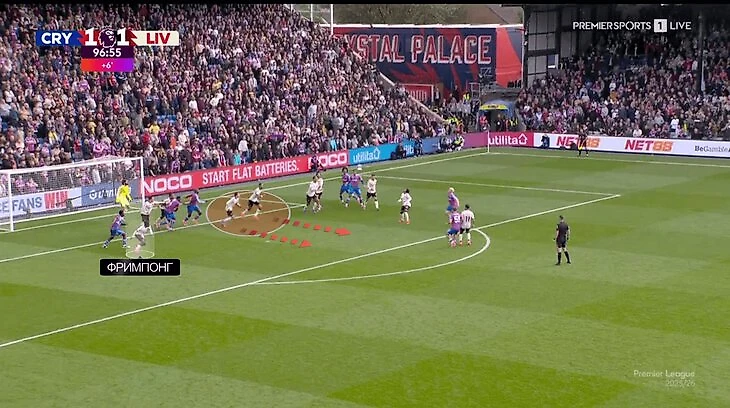Вероятно, виноватых стоит поискать в зоне, из которой «Пэлас» забил победный мяч. Изначально у «Ливерпуля» преимущество – тройку хозяев контролирует пятерка из Коди Гакпо, Федерико Кьезы, Райана Гравенберха, Кертиса Джонса и Джереми Фримпонга.