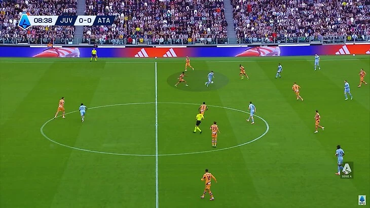 Такой футбол многого требует от инсайдов. Аджич этим требованиям не соответствует. На 9-й минуте «Юве» допустил опасный момент, который родился как раз после такого вертикального паса: Аджич попал под прессинг и потерял мяч.