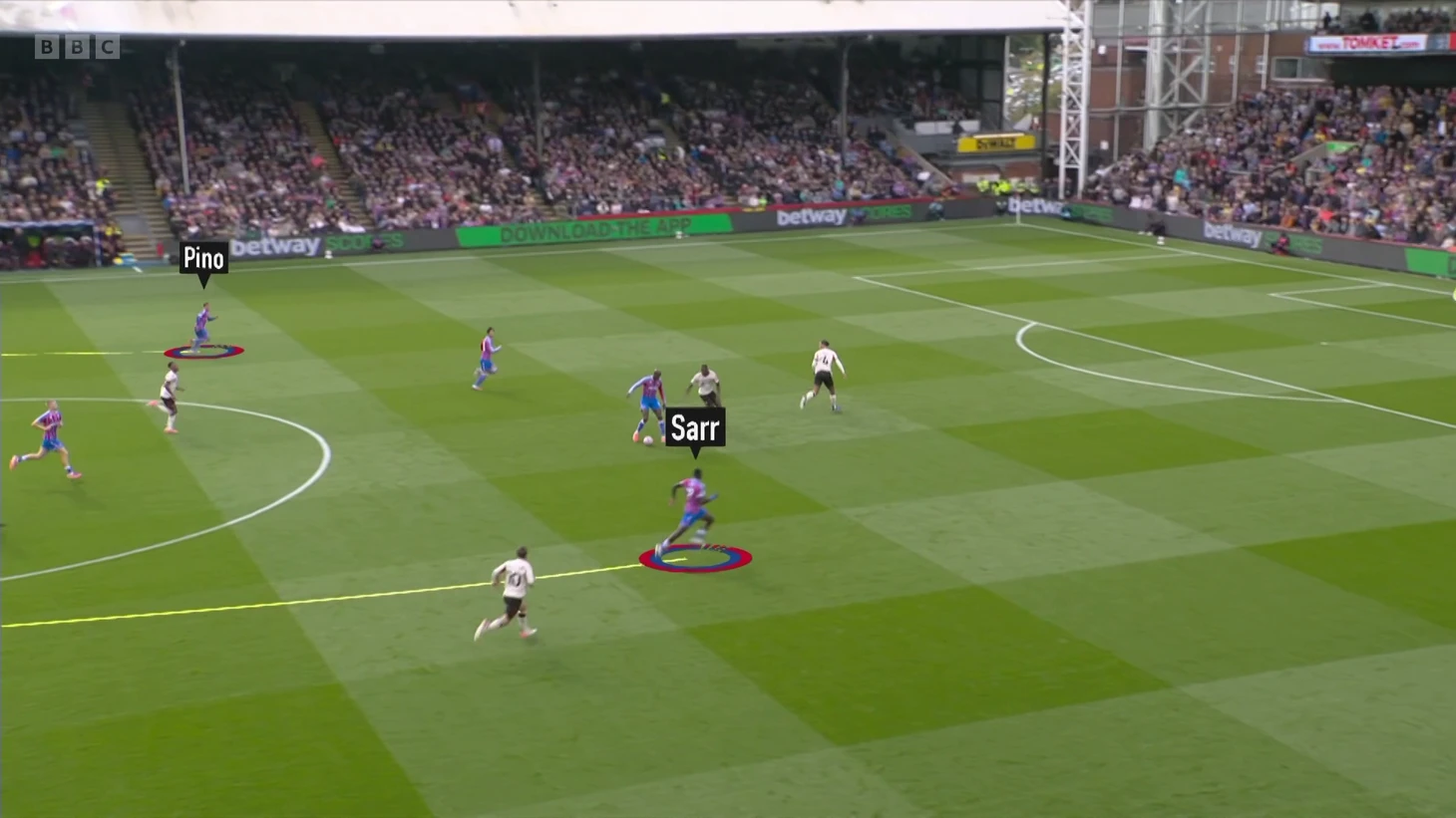 Камада в опорной в рисунке с 72% владения – рискованный ход. Ставка Гласнера сыграла: часть уязвимостей центра прикрыла схема («Пэлас» старается не пускать туда атаки), а выгода от созданных возможностей перевесила ущерб от допущенных.