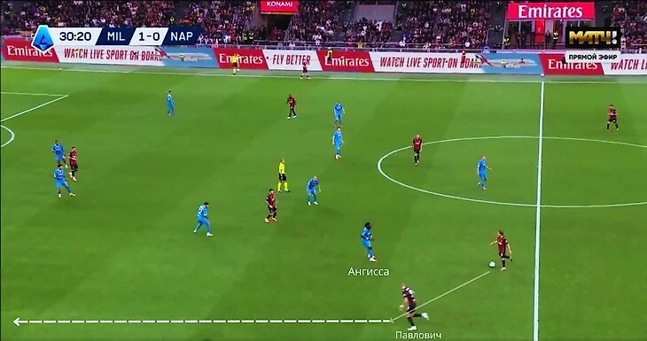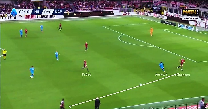 Первый гол прилетел на 3-й минуте и начался с вертикального паса Павловича. Серб открылся ниже остальных защитников; Ангисса промедлил и дал ему возможность без помех начать атаку. Эступиньян оказался без опеки из-за движения Рабьо: Ди Лоренцо запутался, на кого выдвигаться.