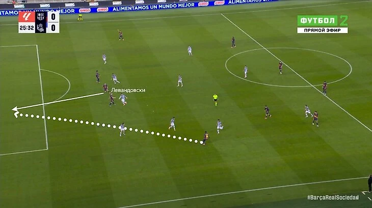 В подыгрыше Роберт пока не так опасен, но есть важный нюанс. Он очень важен в развитии атаки, когда нужно преодолеть давление и предложить дополнительный вариант для передачи. Забросы на форварда в борьбу с целью дальнейшего подбора или комбинации низом после его смещений помогали «Барселоне» справляться с прессингом и выбираться на чужую половину.