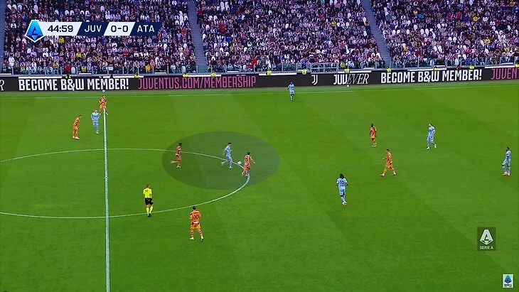 В этих моментах «Юве» не просто терял перспективу (на первом скрине заметно, что инсайд с хорошим контролем мог в два касания бросить мяч в пространство, где Опенда наверняка убежал бы от старика Джимсити), но закапывался и подставлялся.