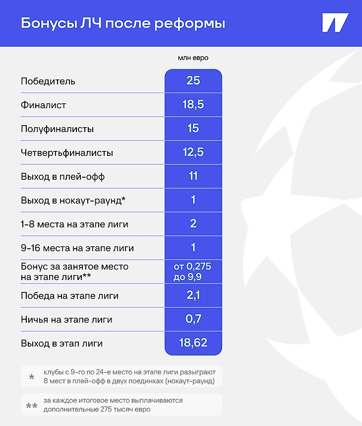 За победу/ничью на основном этапе платят меньше, чем при прошлом формате (было 2,8 млн / 0,9 млн), но за счет большего количества матчей (8 вместо 6) и увеличения бонусов за продвижение по турниру клубы получают заметно больше
