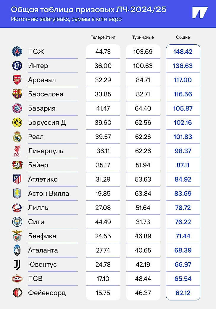 Так, призовые победителя составят более 100 млн евро (108,82 млн при условии восьми побед на этапе лиги). При этом они могут увеличиться – за счет перераспределения сэкономленных денег в ничейных матчах. «ПСЖ» за прошлый сезон заработал соревновательные 103,69 млн евро, «Интер» – 100,63 млн.