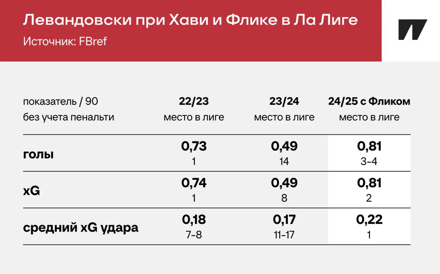 ● При Флике Левандовски провел лучший сезон в карьере по голам. А уже в Ла Лиге превзошел темп при Хави.